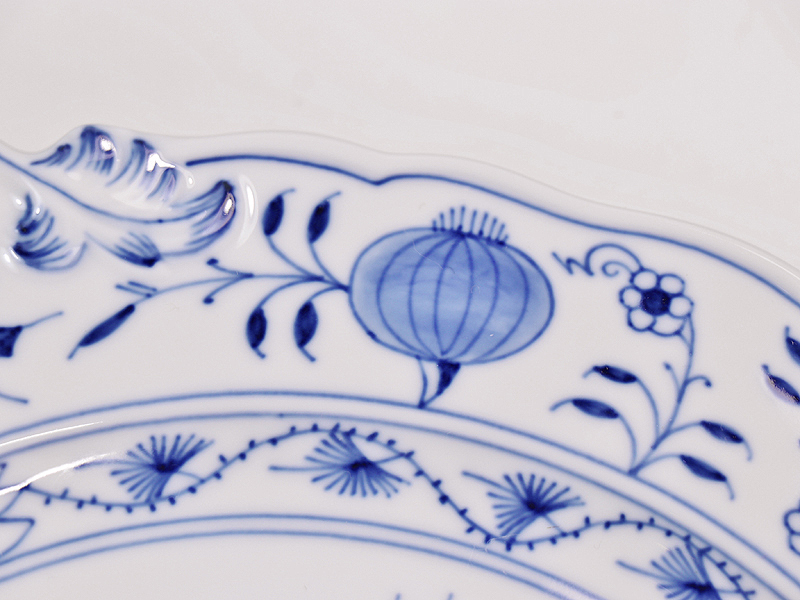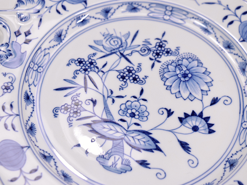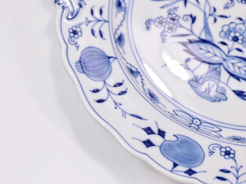 1739年、デザイナー ヨハン・D・クレッチマーが中国写し染付技法で完成させた「ブルーオニオン」シリーズ。 本来は吉祥を司る柘榴を描いたものを玉ネギと見間違えたことが名称の由来となっています。