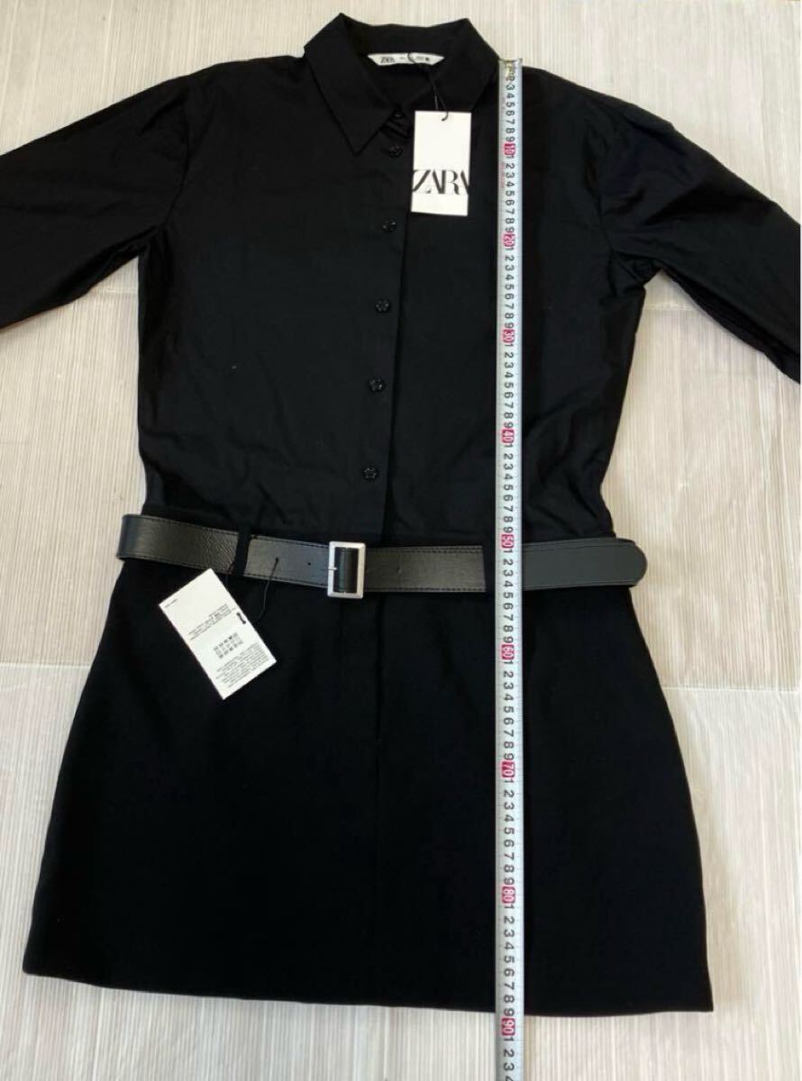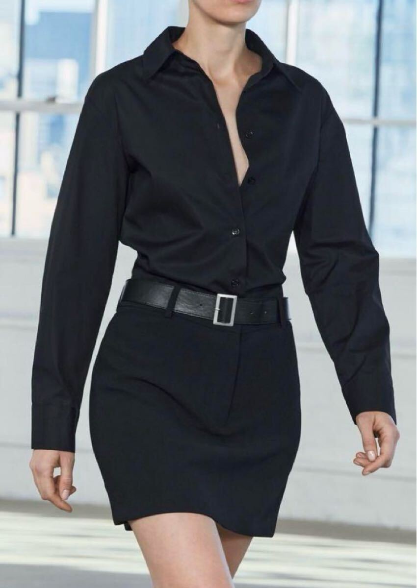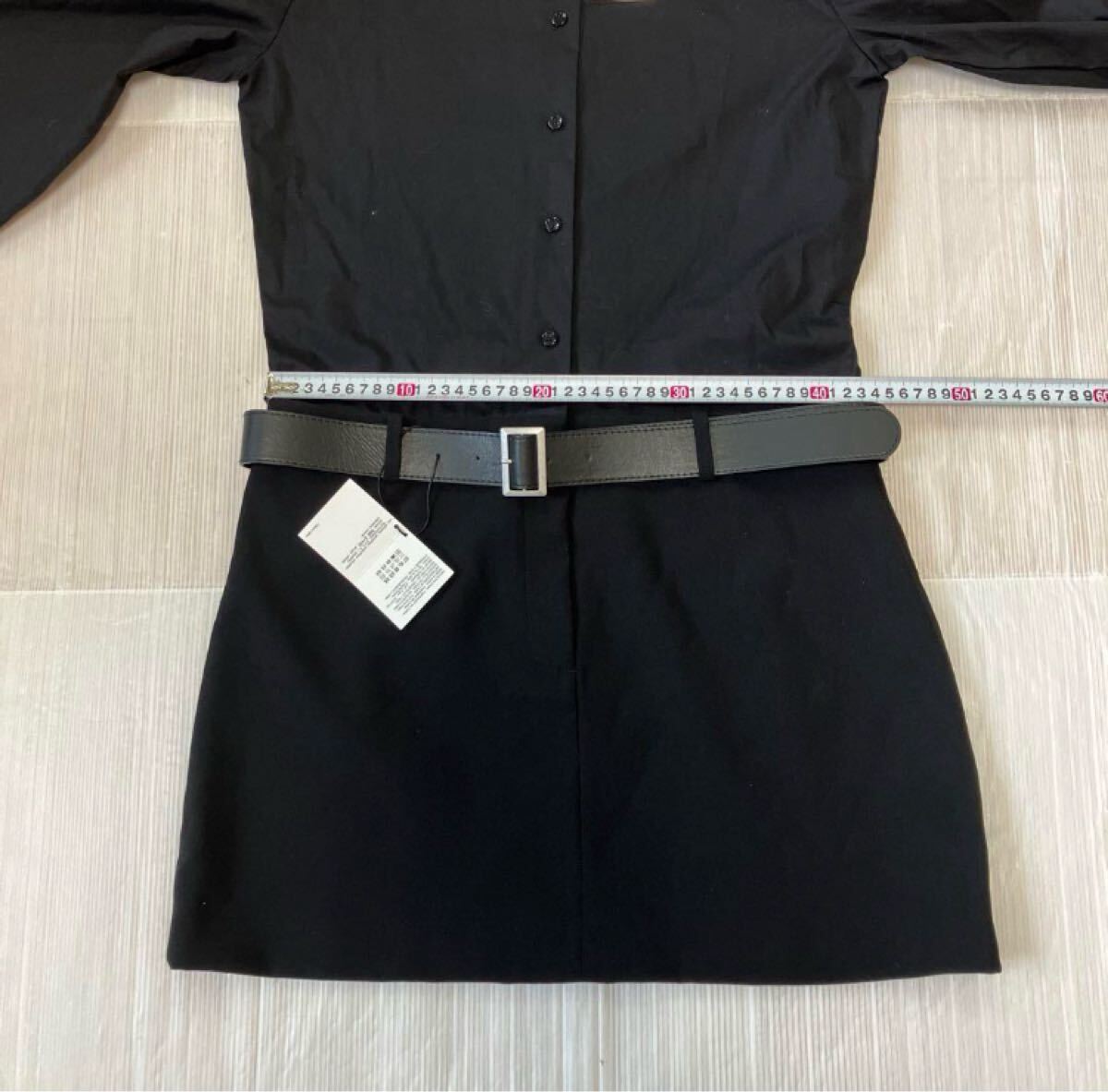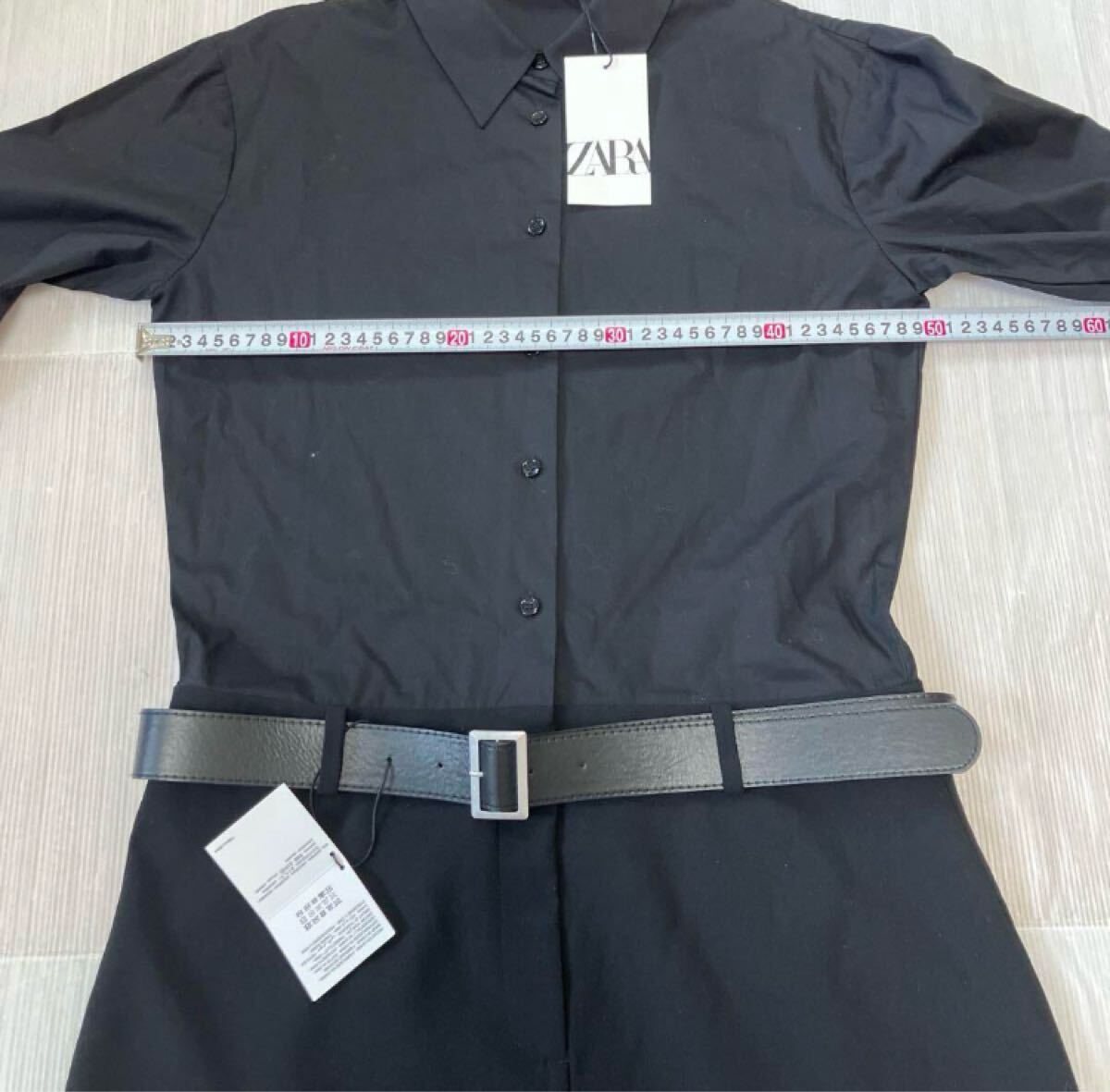 ショート丈の襟付きロングスリーブワンピース、カフス仕上げ、メタルバックル付きアジャスタブルベルト、フロントボタン留め。