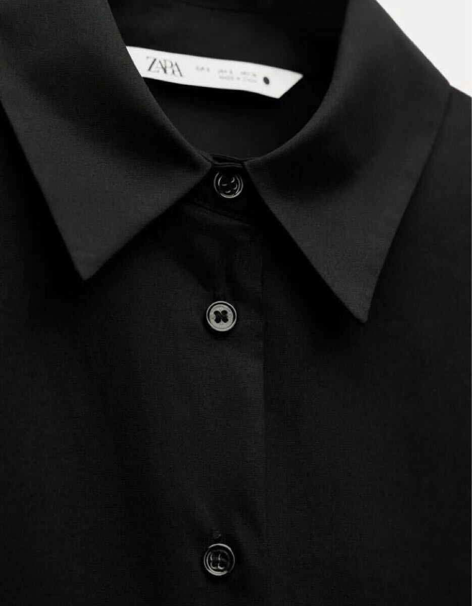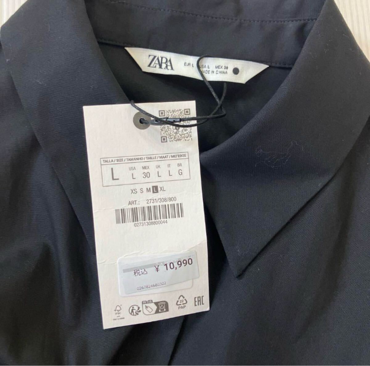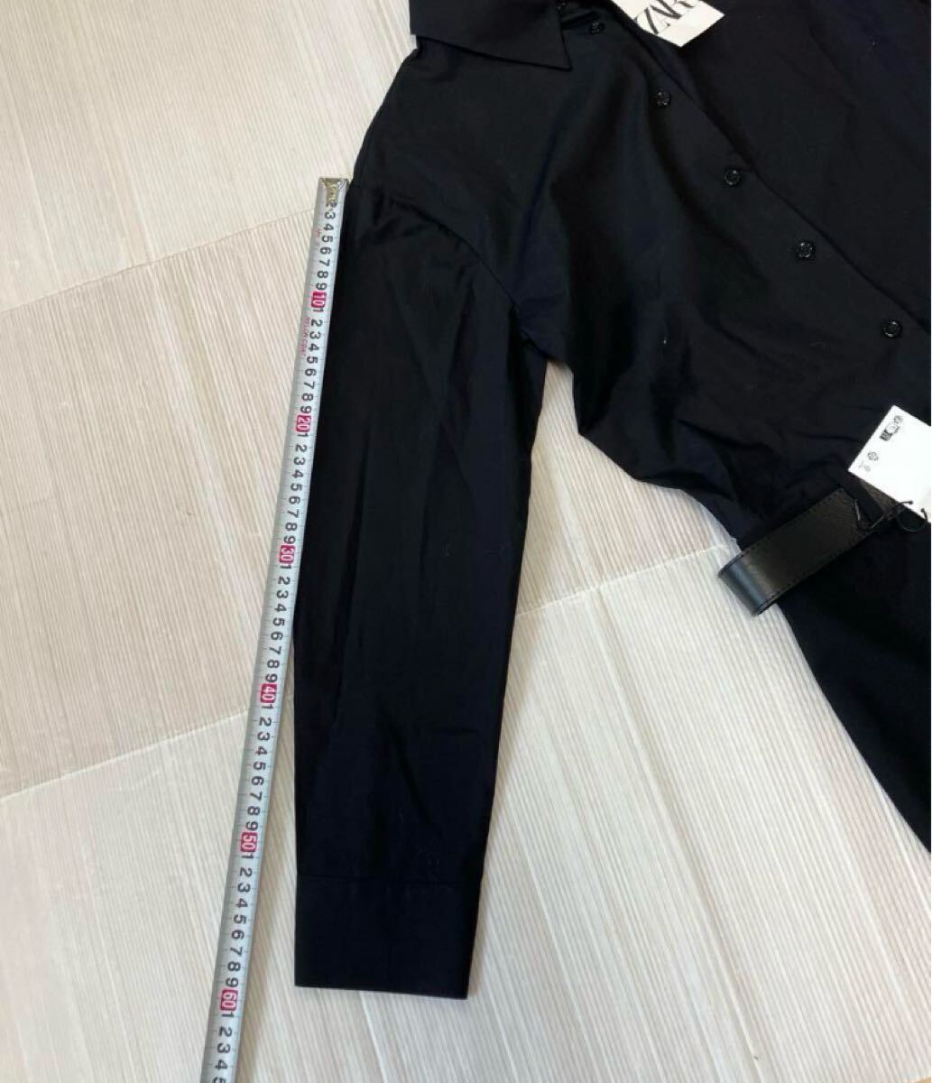 ショート丈の襟付きロングスリーブワンピース、カフス仕上げ、メタルバックル付きアジャスタブルベルト、フロントボタン留め。