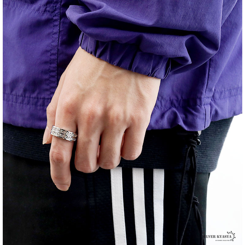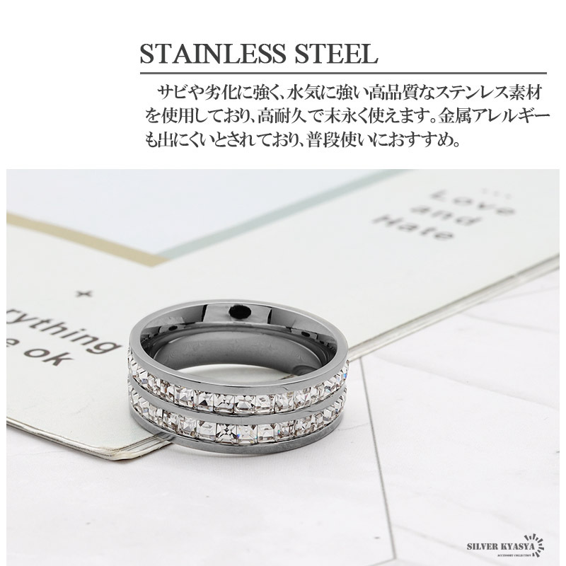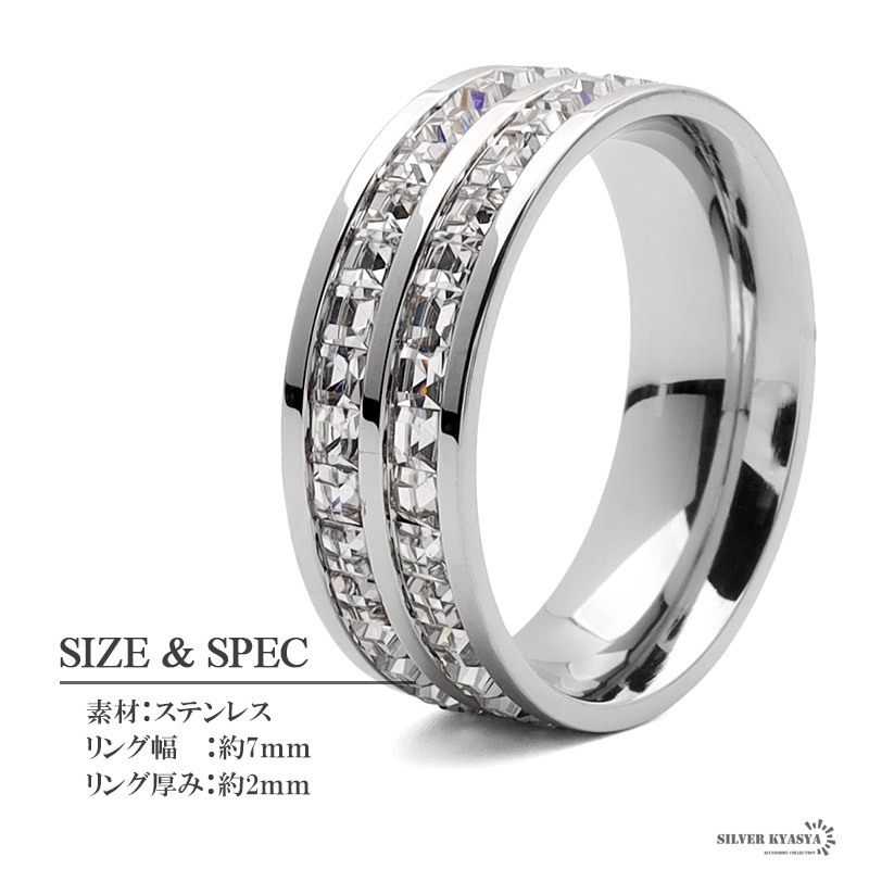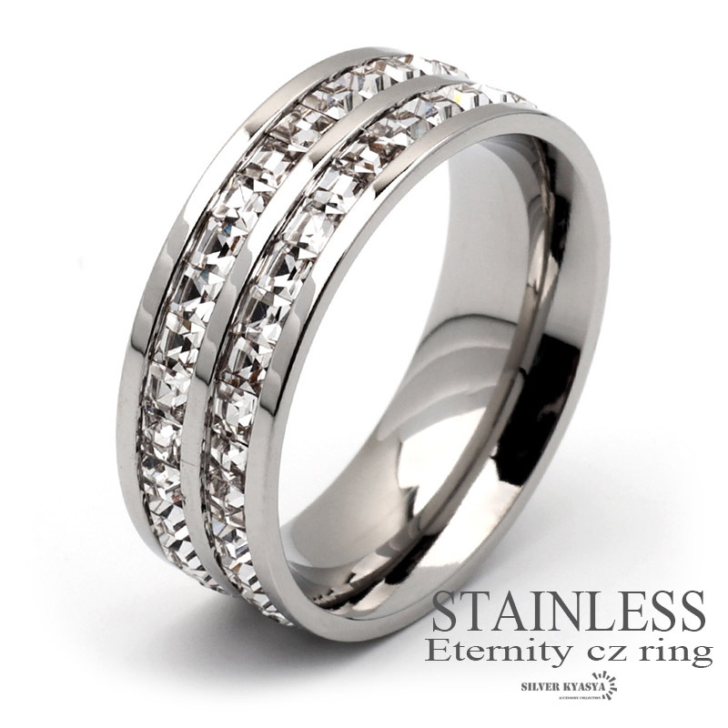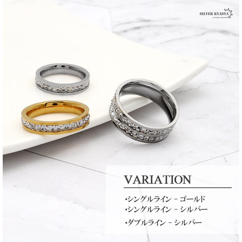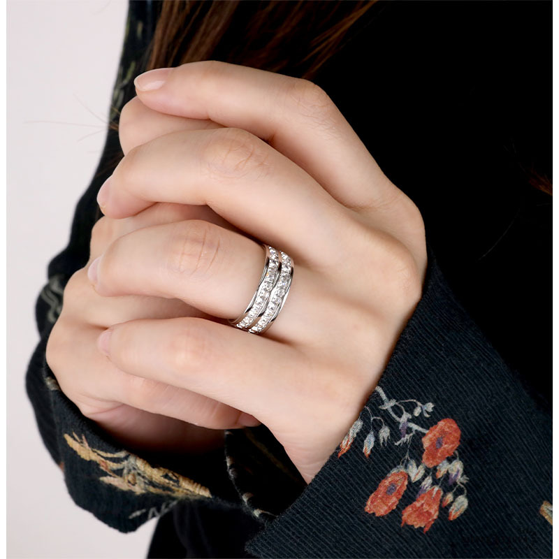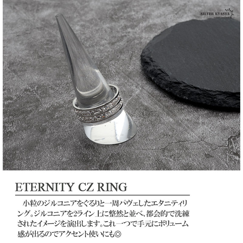 小粒のジルコニアをぐるりと一周パヴェしたエタニティリング。ジルコニアを2ライン上に整然と並べ、都会的で洗練されたイメージを演出します。これ一つで手元にボリューム感が出るのでアクセント使いにも◎