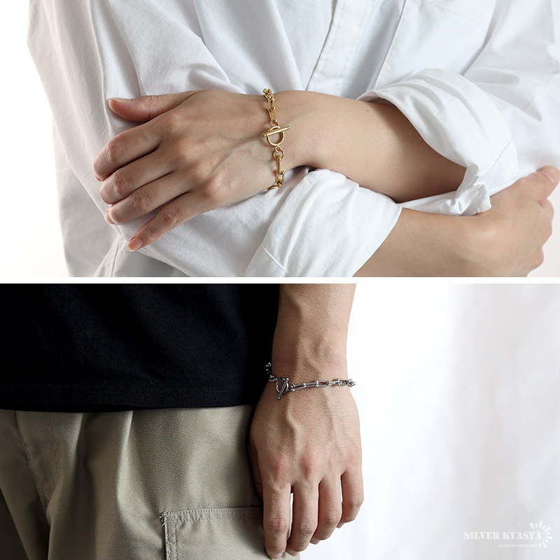 しっかりとした存在感のある特徴的なシルエットのUチェーンを使用したブレスレット。留め具は人気のマンテルタイプを使用。