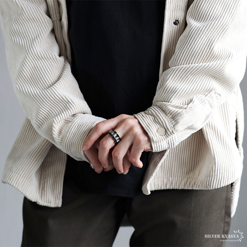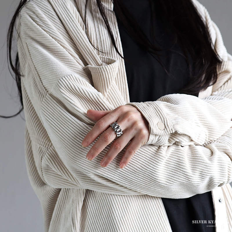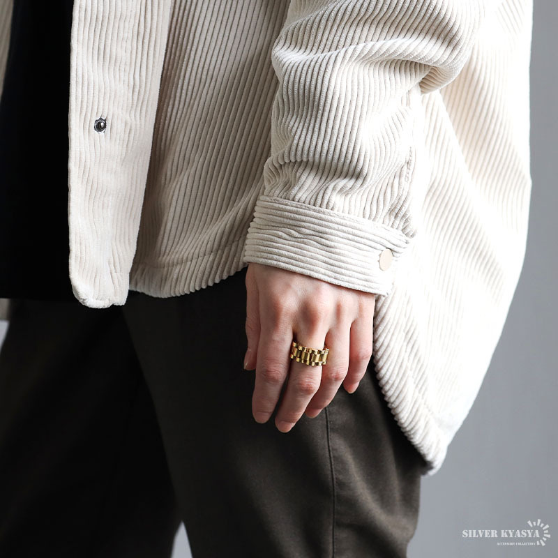 質感と存在感を兼ね備えた時計ベルトデザインのメタルバンドリング。アンティーク仕上げの表面が光をユニークに反射し、指元へ注目を誘います。