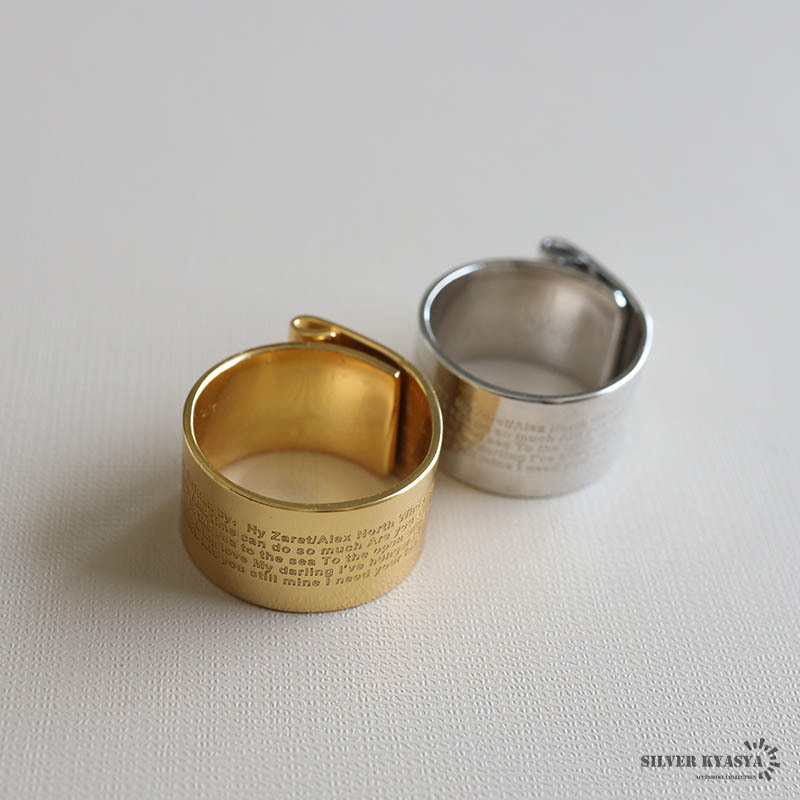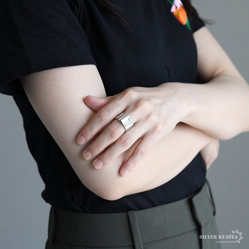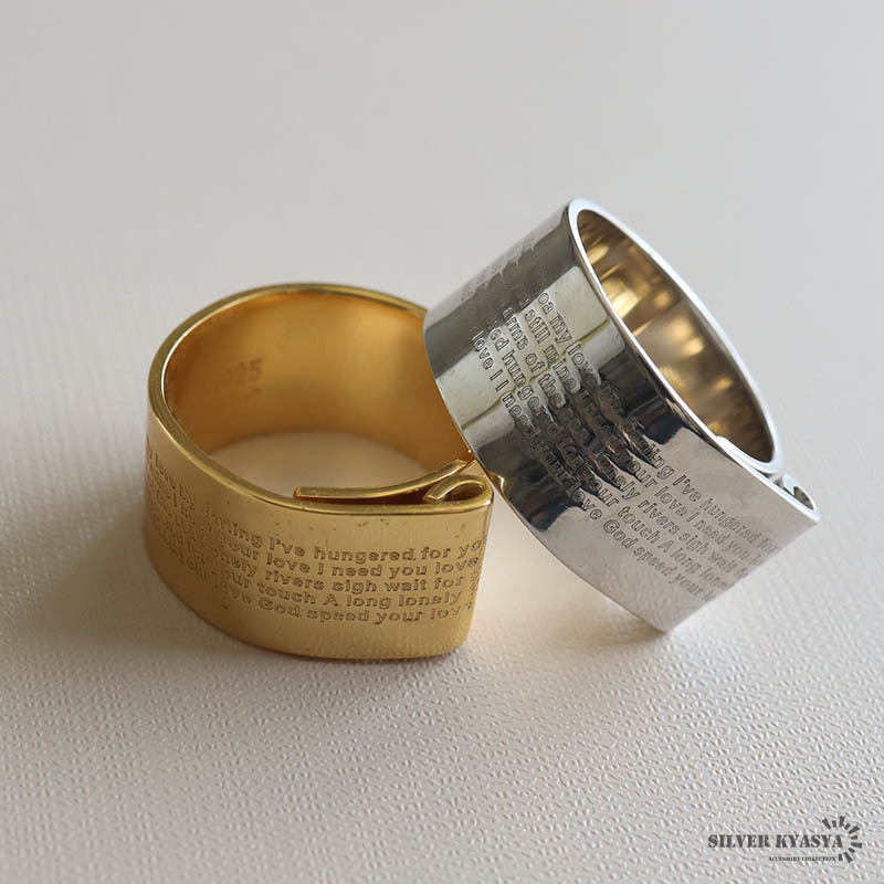 商品概要 | ■ITEM DESIGN 英字が刻まれたワイドなリング。ラベルが重なっているようなさりげないデザイン。「Oh, my love My darling I've hungered for your touch A long, lonely time....」愛あふれる歌詞が描かれたオシャレなアイテム。 ■SILVER925素材 シルバー925は、銀含有率(純度)92.5%を示し、一般的に純銀として扱われています。サビや劣化等がほとんどなく金属アレルギーも出にくいとされており、アクセサリーとして重宝される金属です。 |