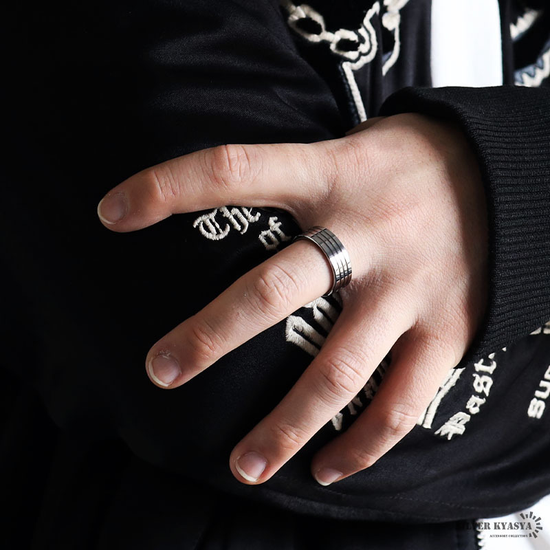3本のラインの入ったシンプルなデザインの平打ちタイプ。サイズ感のある幅で指元をシンプルに彩ります。
