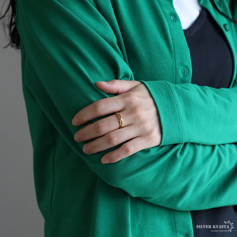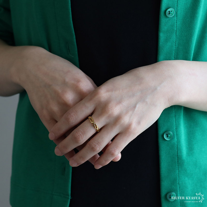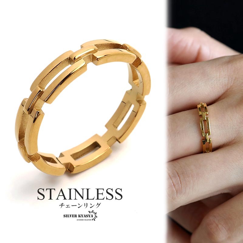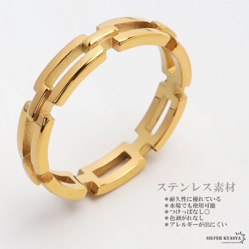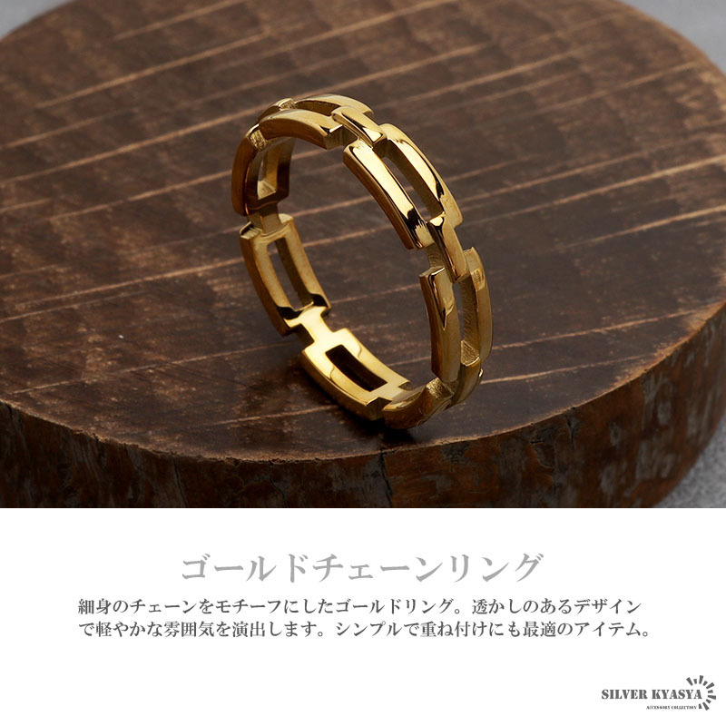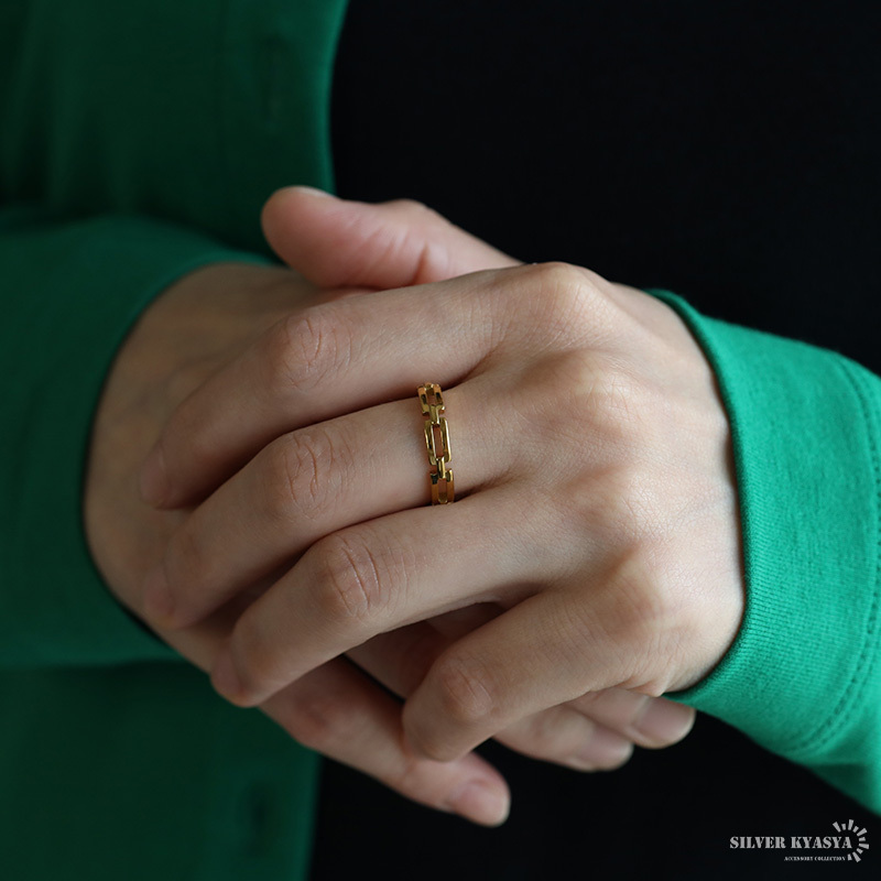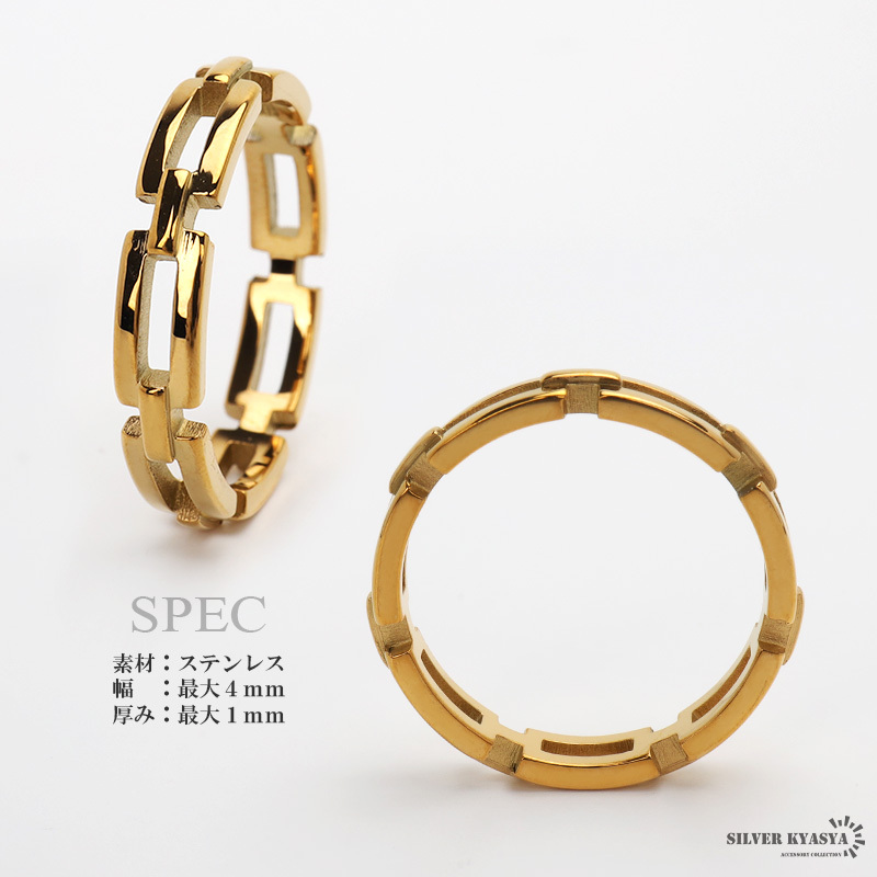 商品概要 | ■ゴールドチェーンリング 細身のチェーンをモチーフにしたゴールドリング。透かしのあるデザインで軽やかな雰囲気を演出します。シンプルで重ね付けにも最適のアイテム。 ■ステンレス素材を使用 金属部分は頑丈なことで知られるステンレス素材を採用。耐久性はもちろん耐水性も高く水場での着用も可能。金属アレルギーも出にくいとされている金属です。 |
