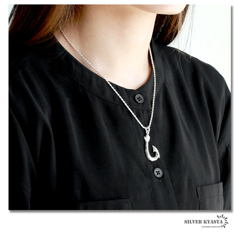 定番人気の釣り針モチーフに職人が丁寧に手彫りした繊細で精巧なレリーフが美しいデザインのトップに、お洒落なロープチェーンをセットしたネックレスです。