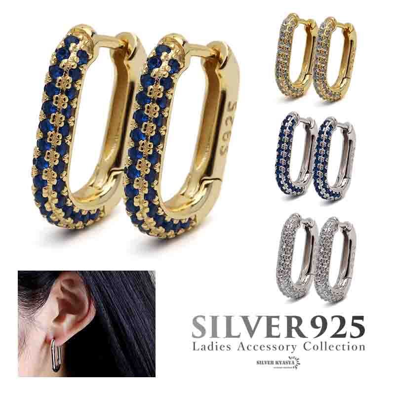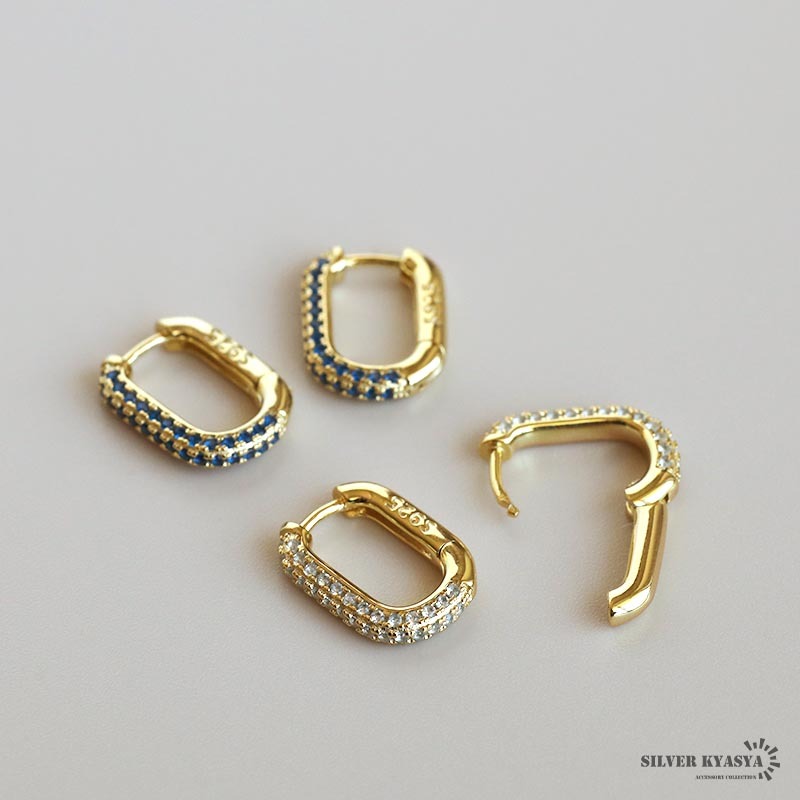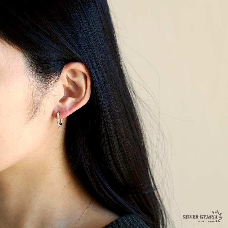 ビジューを細かく敷き詰めたキラキラのフープピアス。すっきりとした縦長のフォルムがフェミニンな雰囲気を演出します。上品でありながら、カジュアルなテイストにも合う万能アイテム。