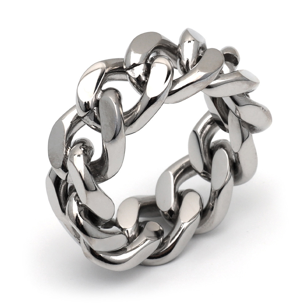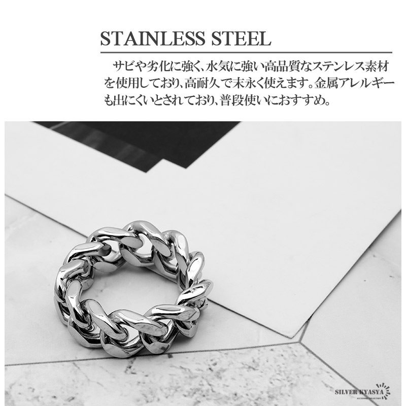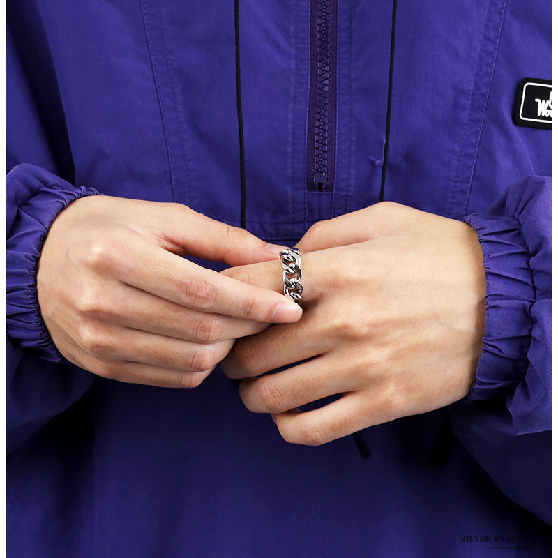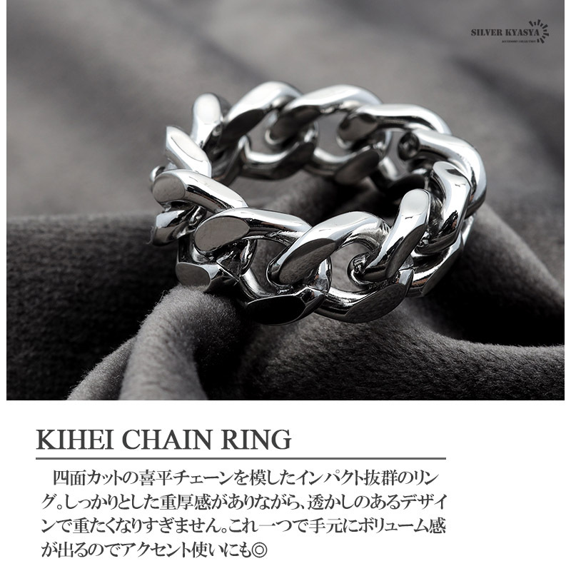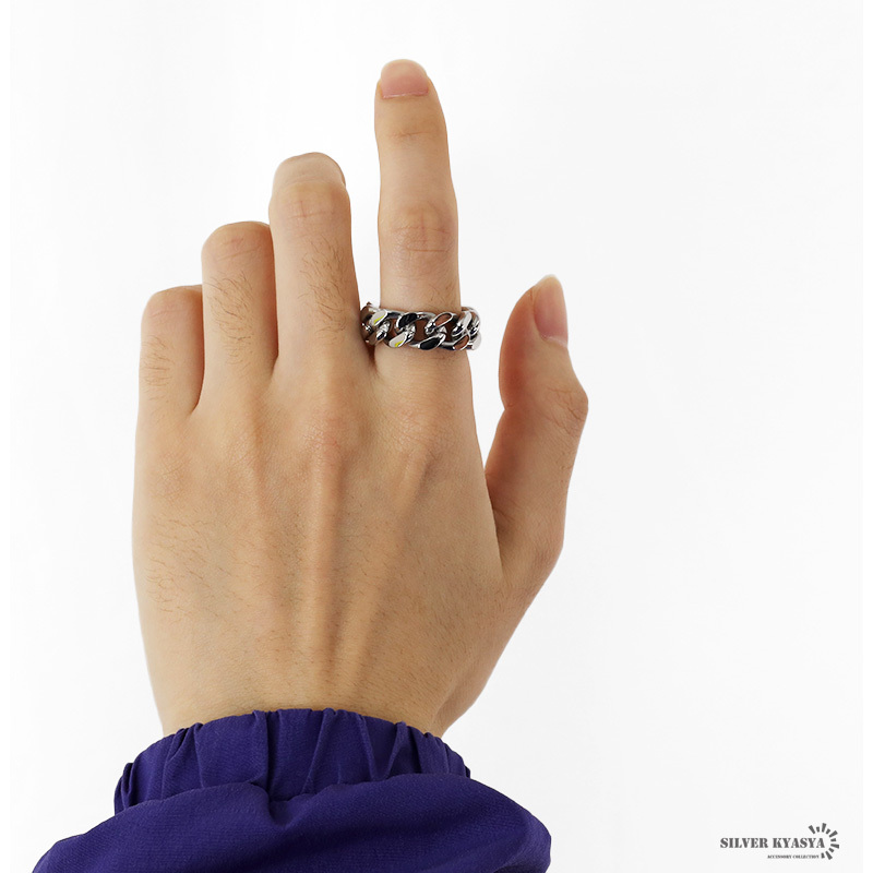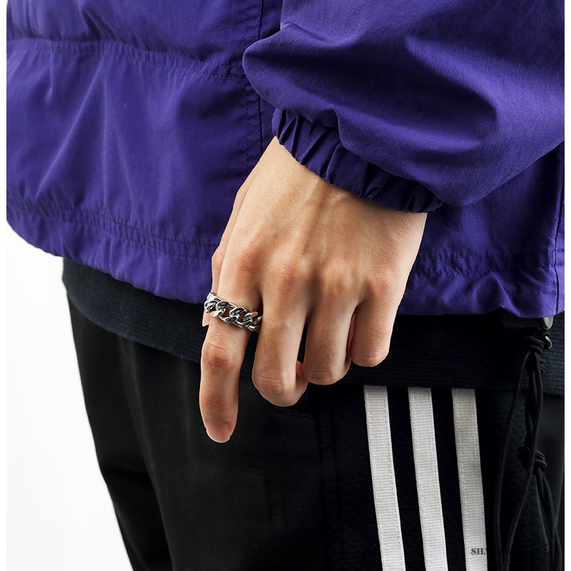 四面カットの喜平チェーンを模したインパクト抜群のリング。しっかりとした重厚感がありながら、透かしのあるデザインで重たくなりすぎません。これ一つで手元にボリューム感が出るのでアクセント使いにも◎