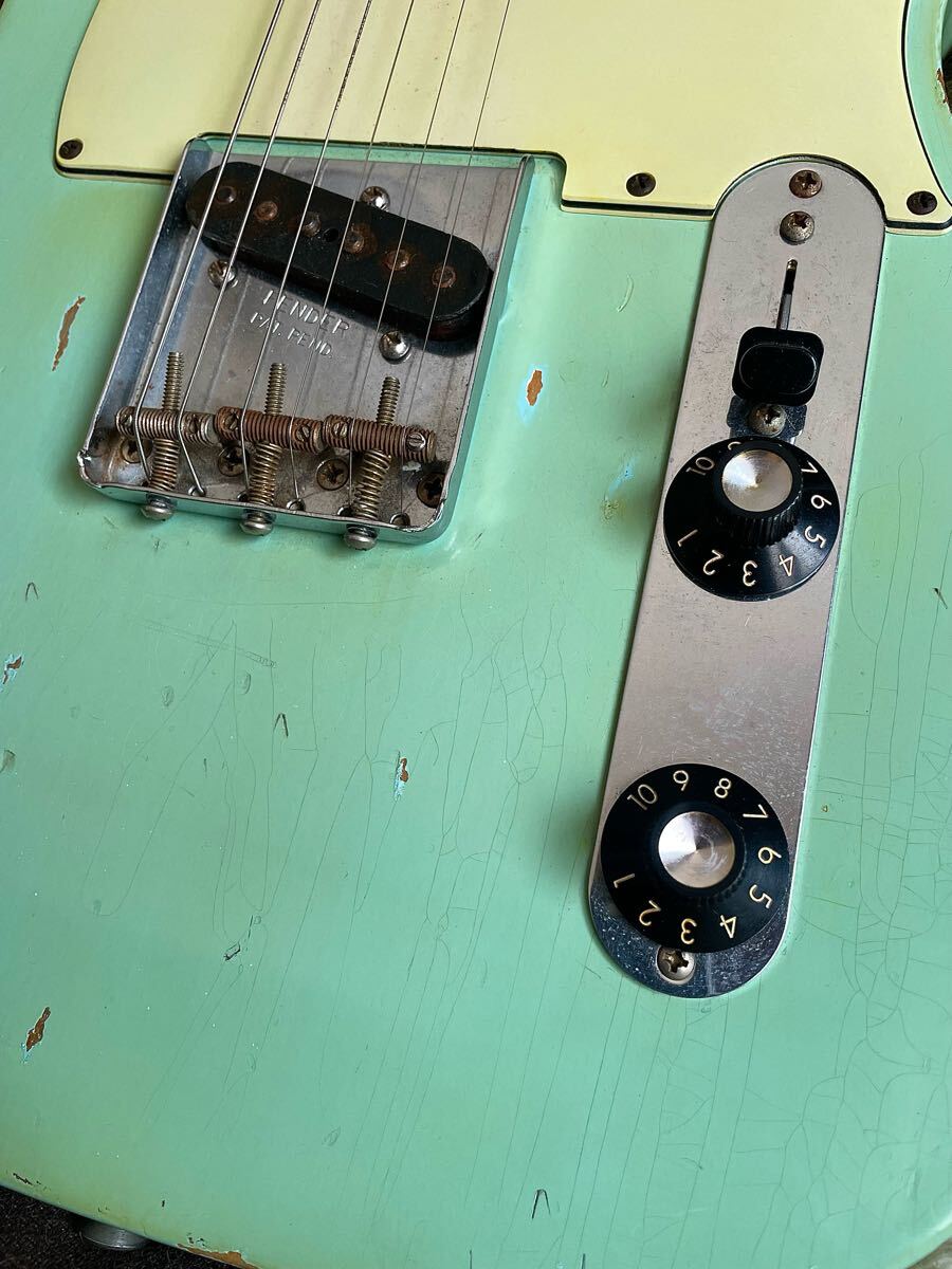 カラーは希少なダフネブルー。キャビティ内には手書きでDaphne Blueを意味するDNBの表記があります。経年劣化による黄ばみでサーフグリーンのような良い雰囲気になっており、ボディ全体とヘッドにウェザーチェックがあります。写真で見るよりウェザーチェックははっきり見えます。(写真7枚目参照)