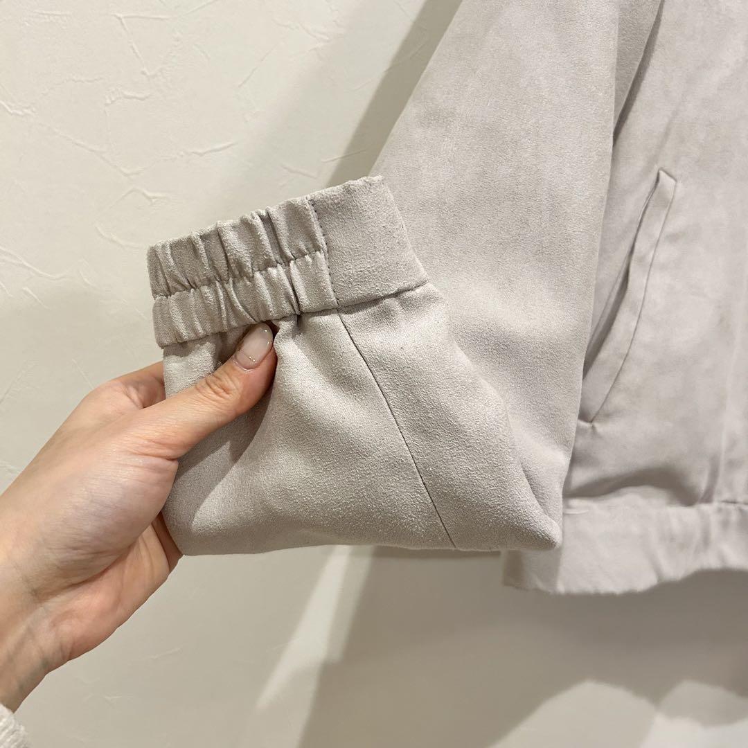 スエード調のやわらかな風合いで上品見え。袖口・背中はギャザー仕様で、動きやすさと女性らしいシルエットを両立。