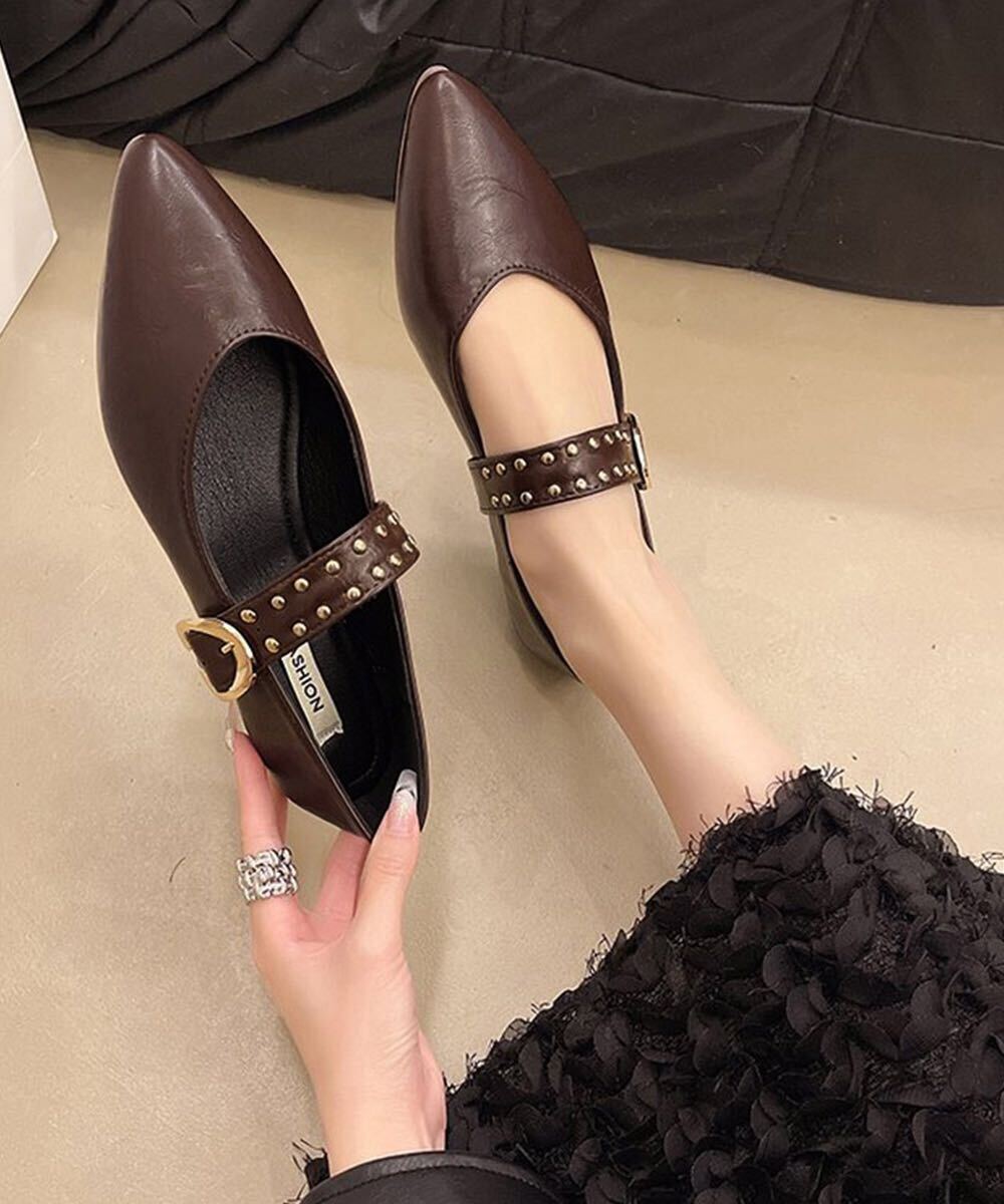 洗練されたポインテッドトゥとスタッズ付きストラップが印象的な、クラシカルモダンなフラットパンプスです