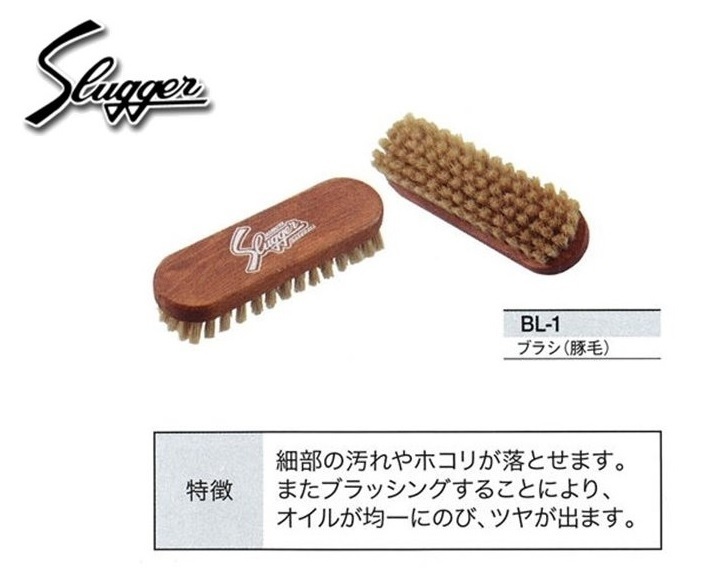使用された後のグラブ、ミットのブラッシング用のブラシです。表面に付いた泥やホコリをまずはこのブラシを使って落として下さい。その後に、クリーナーやレザーローションによるお手入れをしてください。