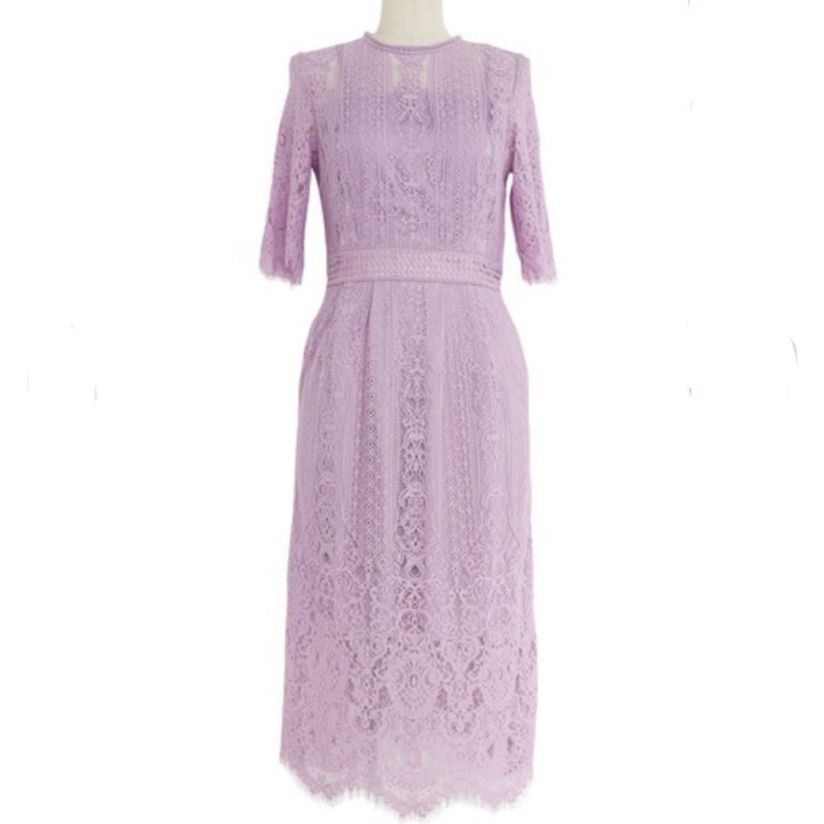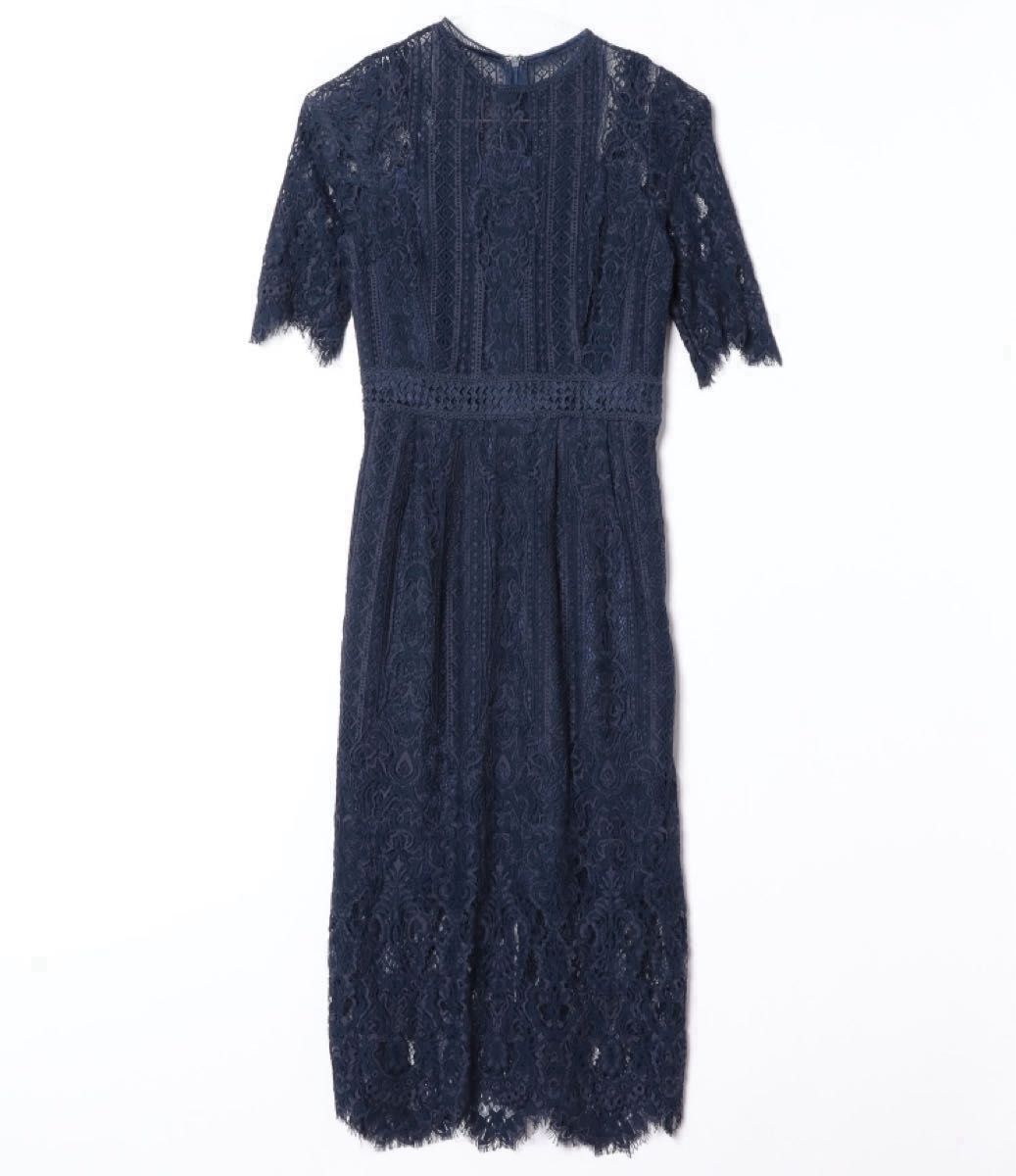 見映えする大きいパネル柄レースを全体に使用し、ウエストは格子柄のはしごレースで切り替えたミディ丈ドレス。