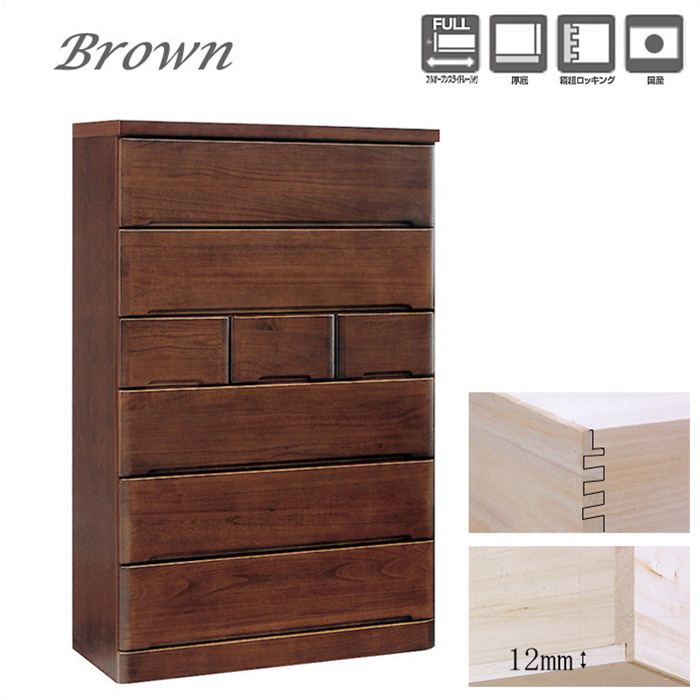 特  徴幅90cm天然木桐無垢材のシンプルな国産チェストです。長引き出しは奥まで出し入れしやすいフルオープンスライドレール付き。引き出しはロッキング箱組み、ベタ底12mmで強度があります。完成品ウレタン塗装ナチュラル・ブラウンの2色対応。