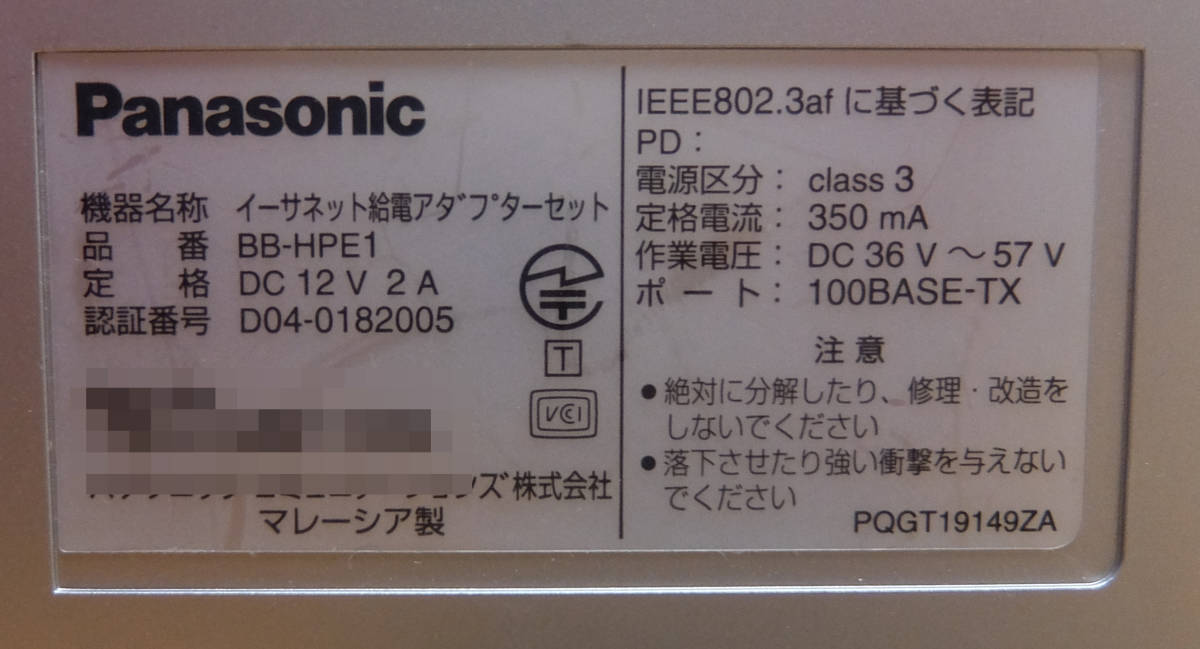 パナソニック Panasonic ネットワークカメラ用 イーサーネット送電アダプター BB-HPE1です。