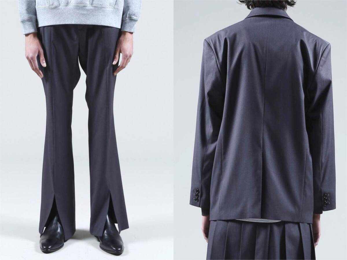 裾のフロントにスリットが入ったフレアパンツ。裾広がりになっているシルエットは脚長・細見え効果があり、近年トレンドのオーバーサイズアウターとも好相性です。