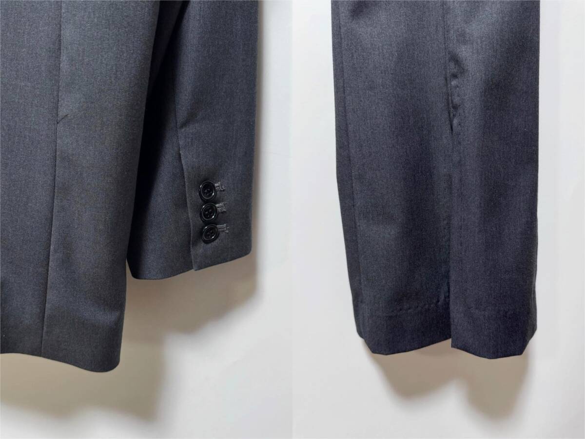 ピークドラペル、2ボタン、センターベント、袖は3ボタンの本切羽仕様。