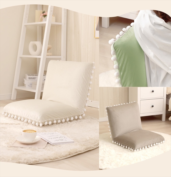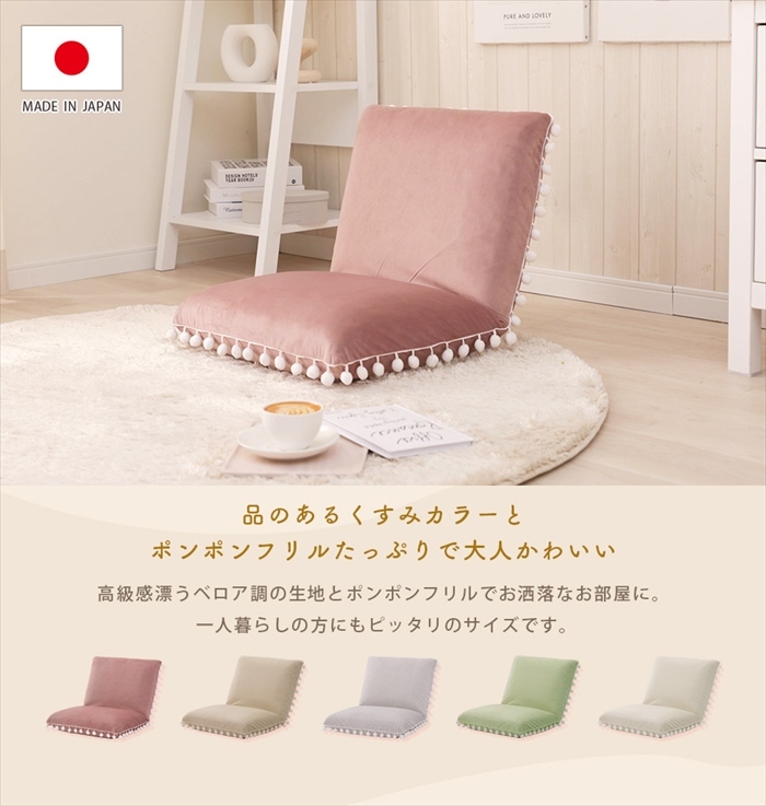 | ・周りについたコロンとしたポンポンがかわいい座椅子 ・14段階リクライニング機能付き ・上質な質感のベロア生地を採用 ・安心安全の日本製 |