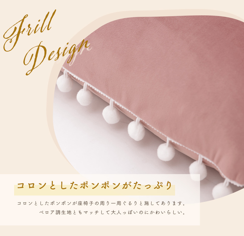| 品のあるくすみカラーとポンポンフリルが大人かわいいリクライニング座椅子。 ワンルームでも圧迫感なく使えるコンパクトサイズ。 安心の日本メーカーの14段ギアを使用したリクライニング機能付き。 かわいいだけでなく、長時間座っても疲れにくい座り心地にもこだわりました。 生地には上質な質感のベロア生地を採用。 背面にもこだわり、お部屋の中央に置いても◎ コロンとしたポンポンを座椅子の周りにぐるりと施し、ベロア調生地ともマッチして大人っぽいのに可愛らしいを実現しました。 |