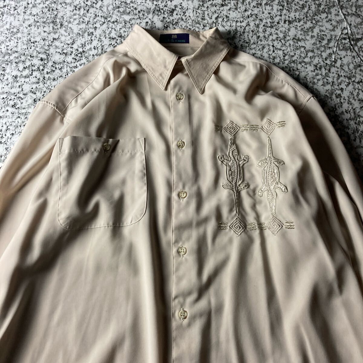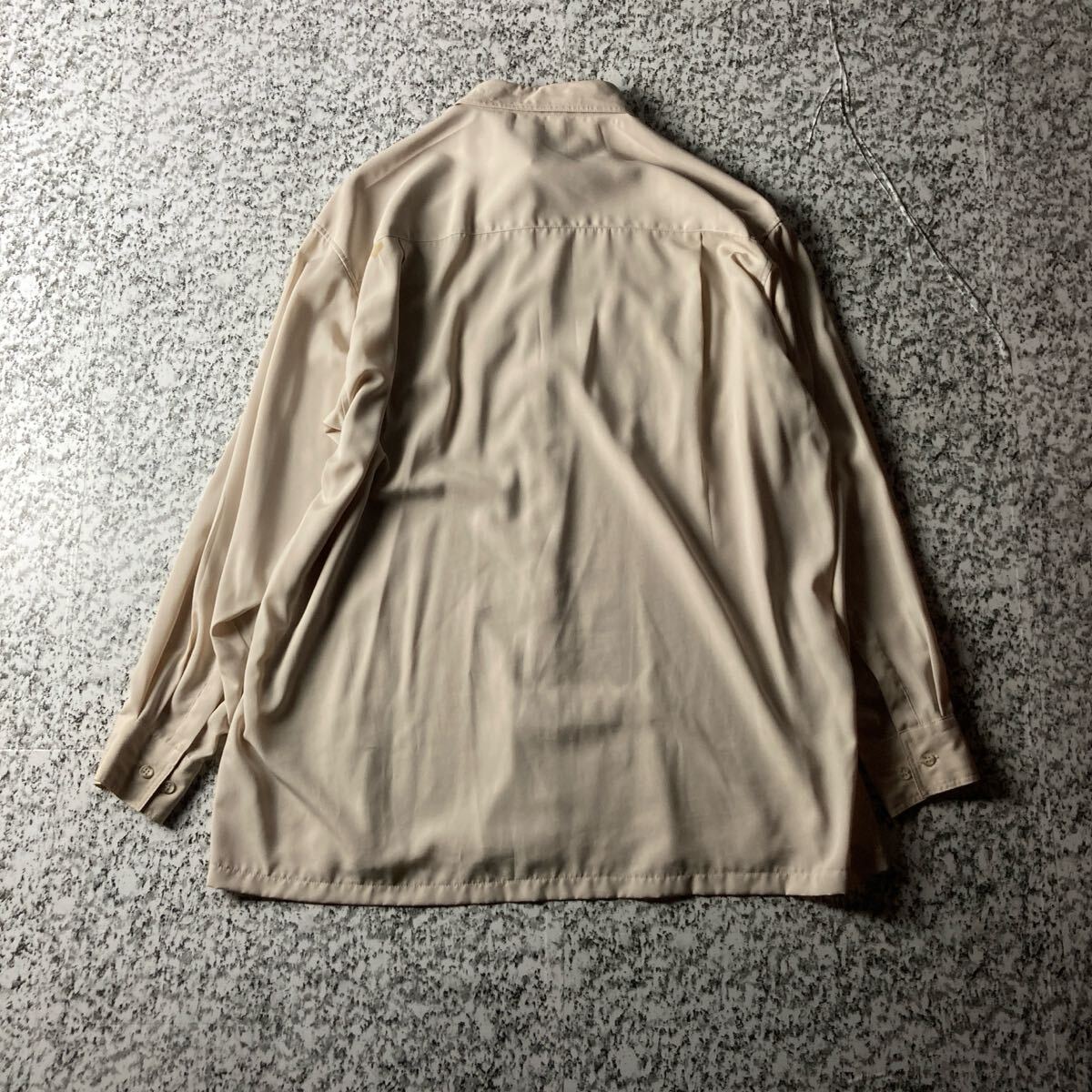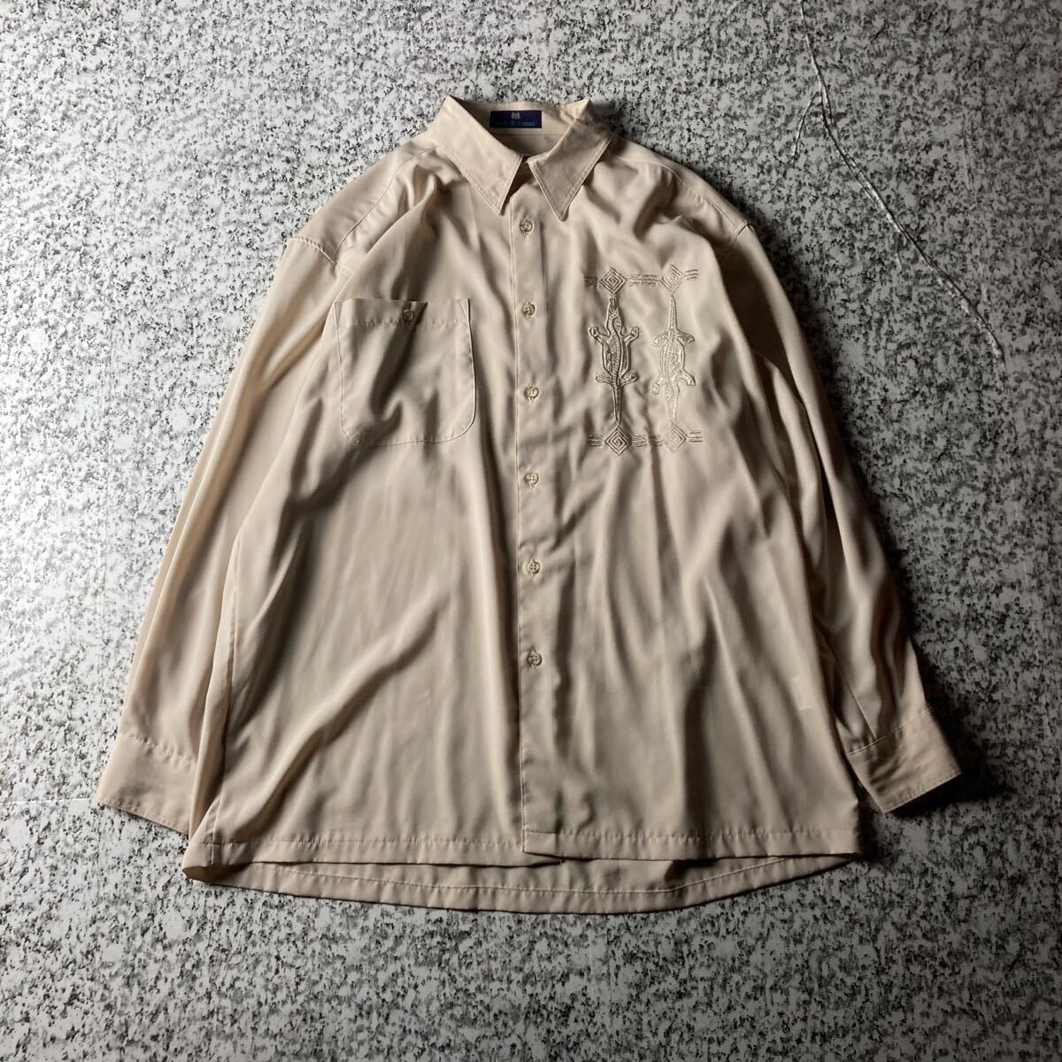【90sオールド】刺繍デザイン ドレープ とろみ感 L/Sポリシャツ 古着 アイボリー Mサイズ 長袖シャツ
