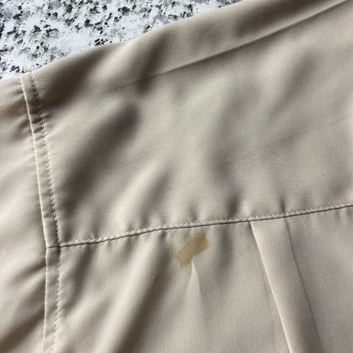 後ろ見頃に目立つ汚れ、前見頃に小さな汚れがあります。