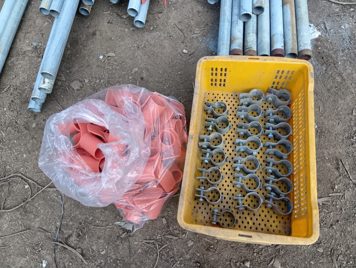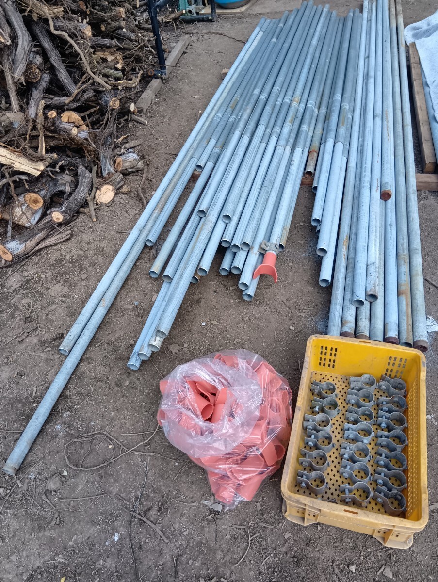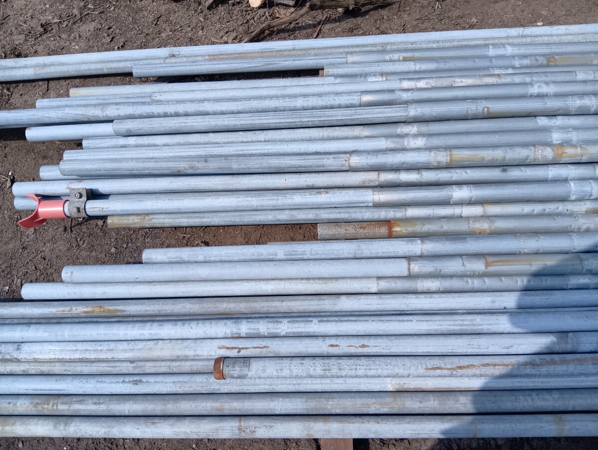Φ42+Φ38 長さはバラバラで2.2m~3.7m36本(Φ42にΦ38のパイプが50cm位入っており、潰されているので抜けないかと思います。不安な方はステンレスの鉄筋ビスを打ち込む等して下さい。スチール製の安物鉄筋ビスだと打ち込めないかも知れません。)