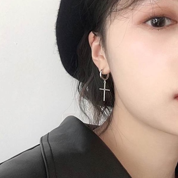 存在感のあるクロスチャームがトレンドデザインのフープピアス。