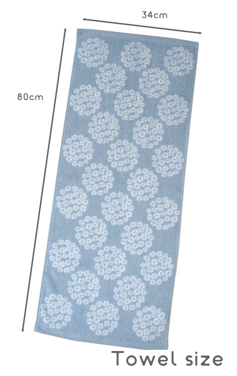 「花束」をモチーフにつくられたデザイン。少しくすんだ色合いが優しいイメージとぴったりです。普通の糸より、撚りが甘いあま撚り糸を使った、ふんわりと肌触りのやさしいタオルです。