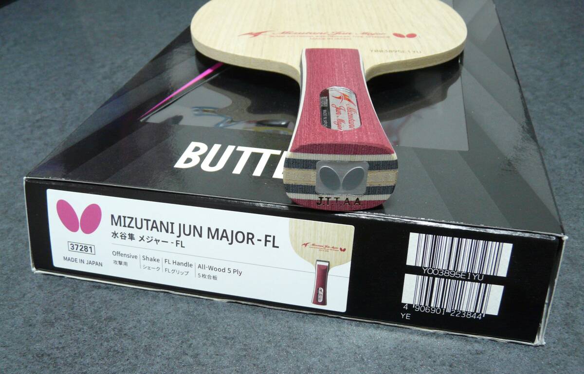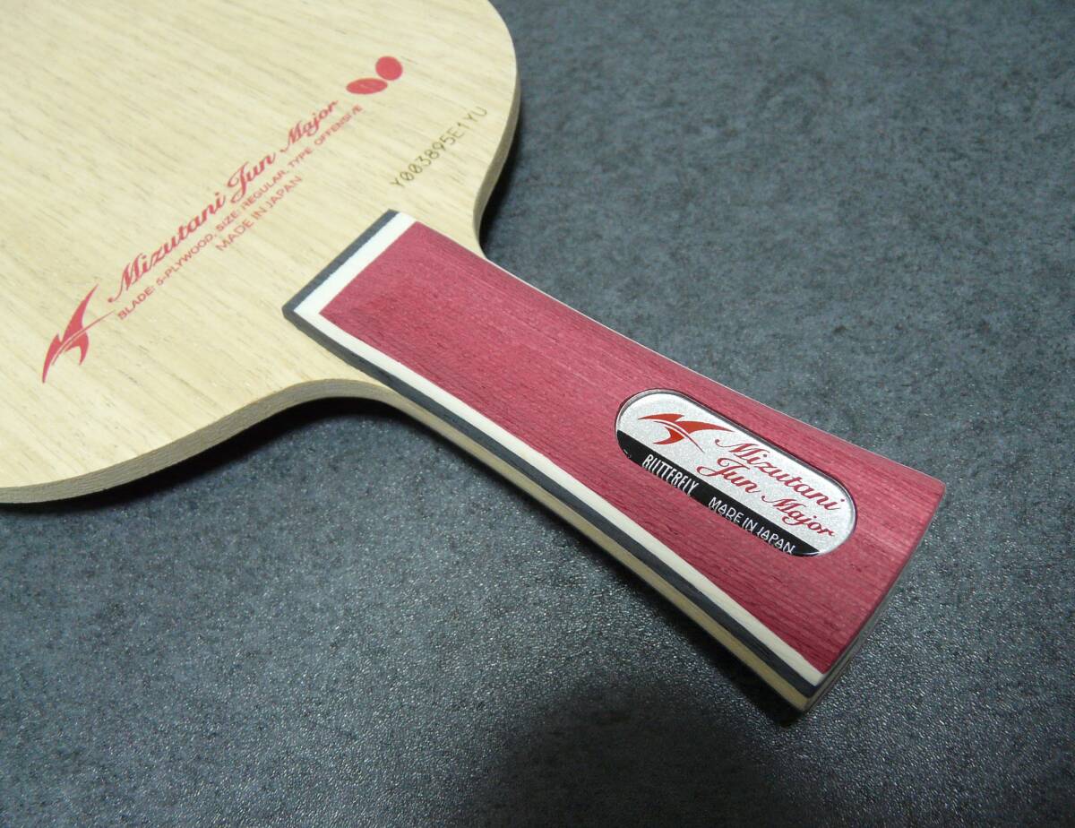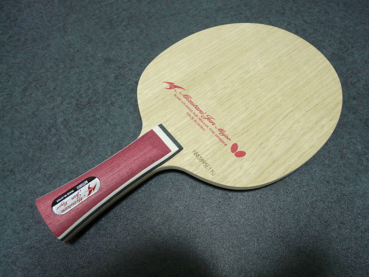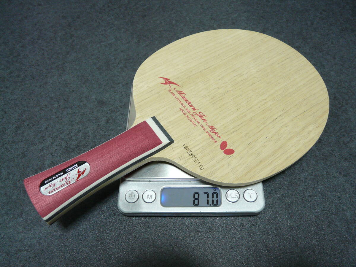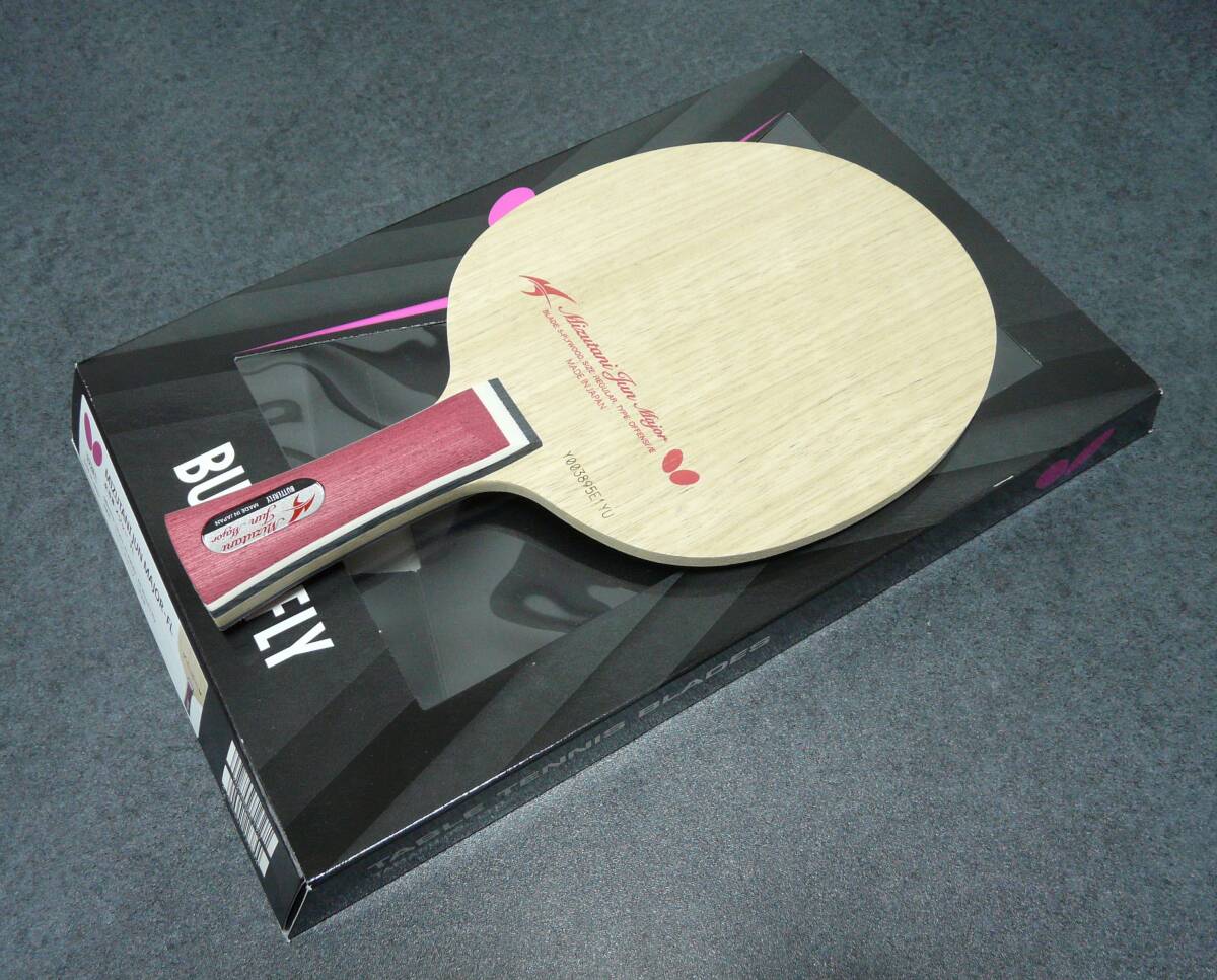 バタフライ 水谷隼 メジャー FL。新品未使用。出品時重量は87.0g。板厚5.57mm。板薄めで中庸な重量です。よろしくお願いします。管理番号MJ13