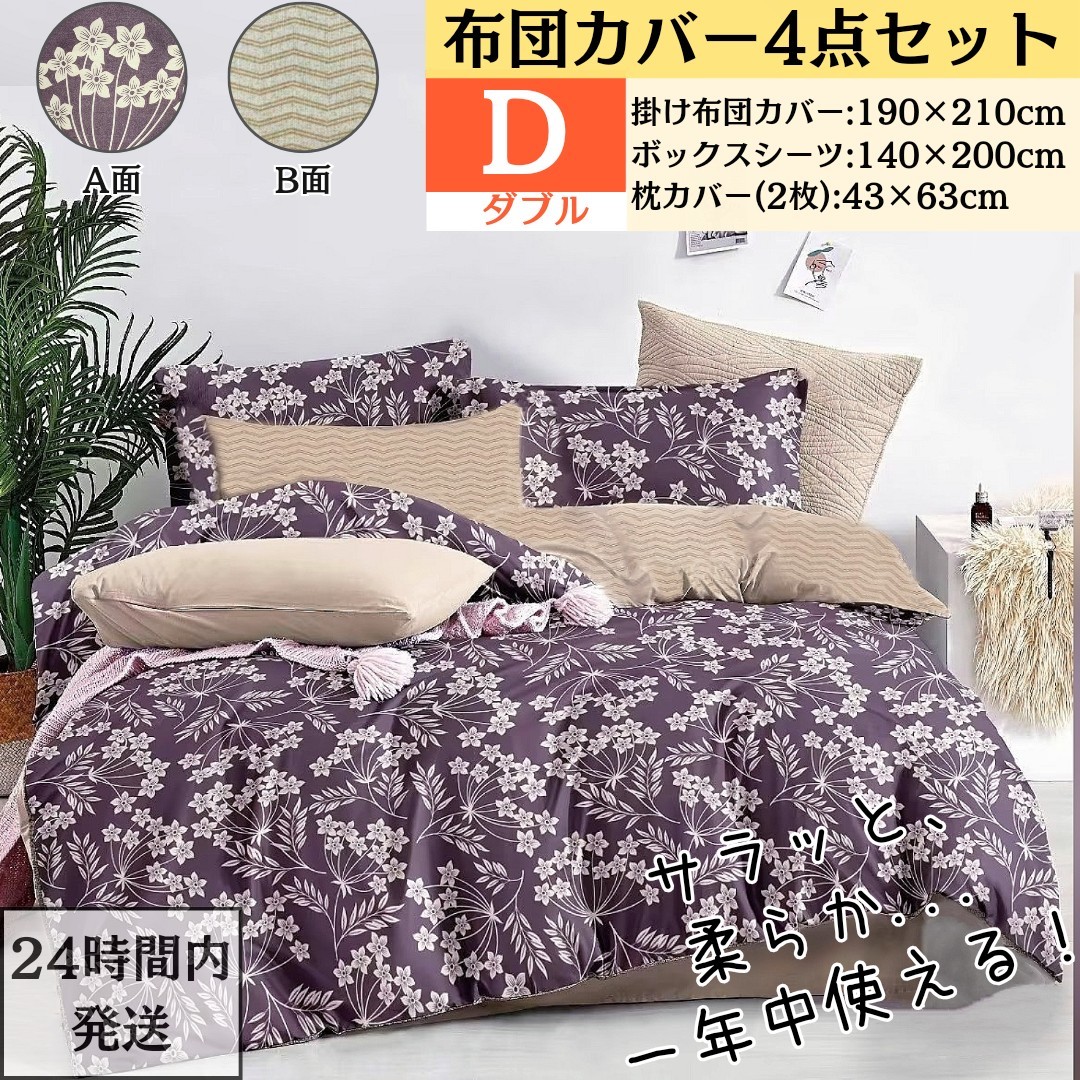布団カバー 4点セット ダブル 掛け布団カバー ボックスシーツ 枕カバー ベッド マットレス 敷き布団 対応 洋式 和式 四季 兼用 リバーシブル AB両面柄 肌ざわりがよい 洗い替え 吸汗 速乾 通気 抗菌 防臭 防ダニ オールシーズン 丸洗い可能