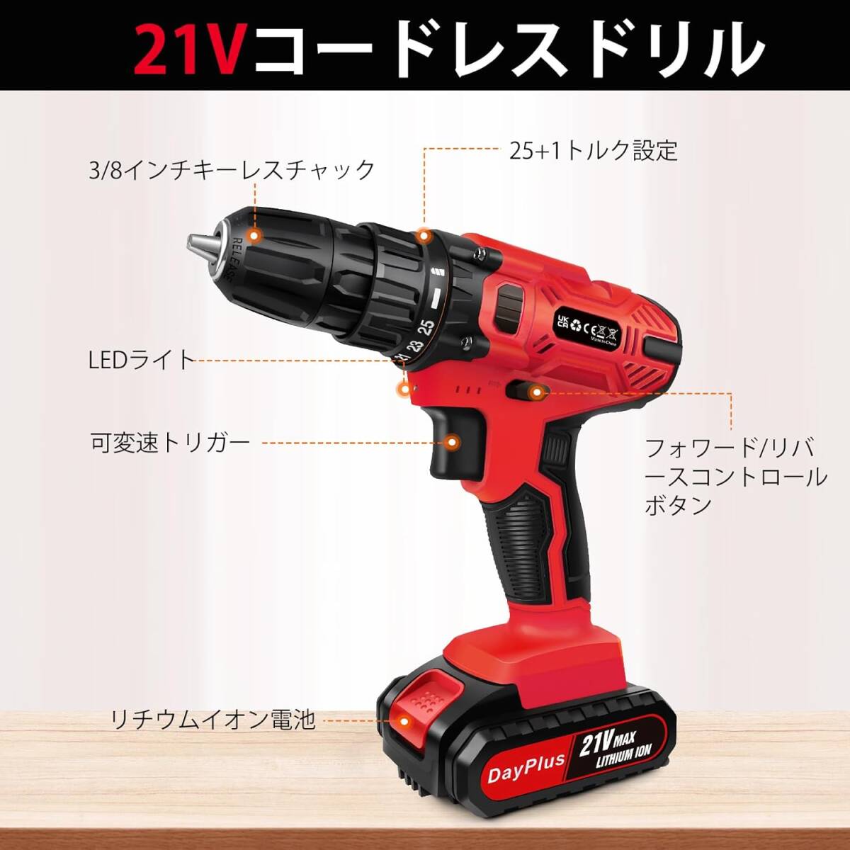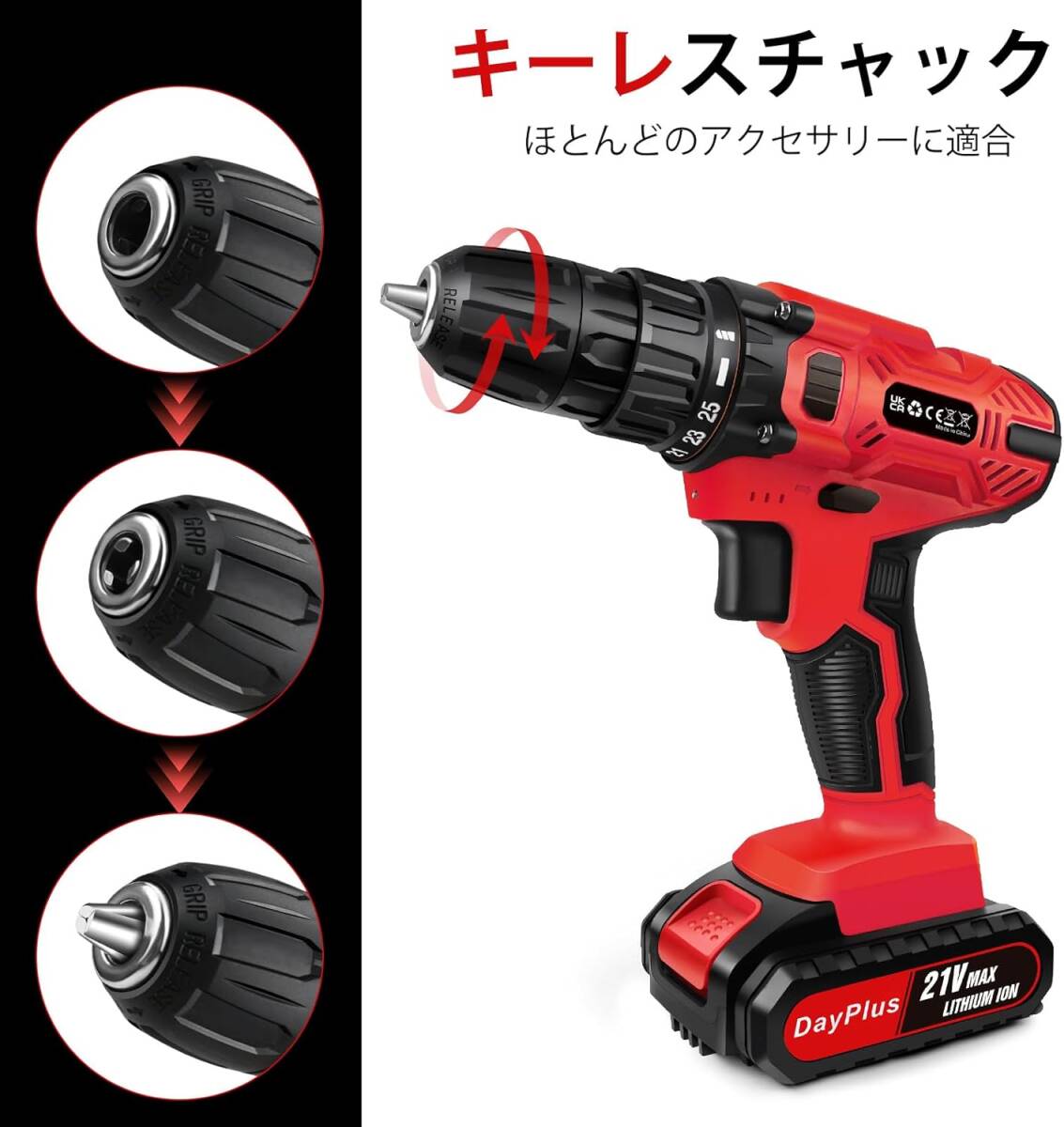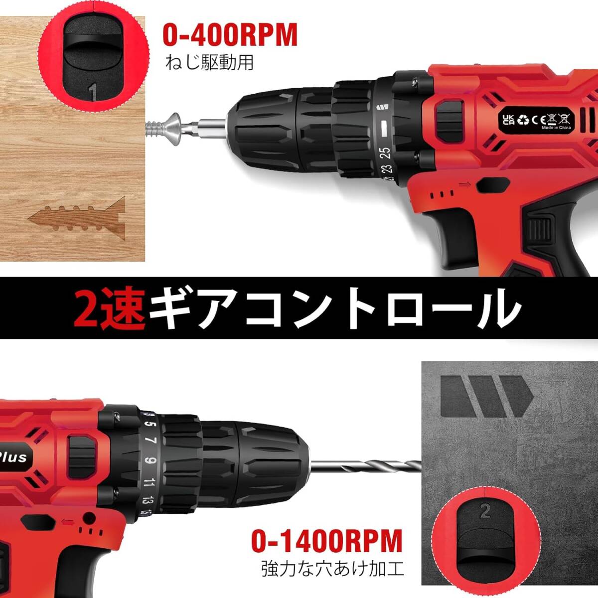 電動ドライバー 電動ドリル 21V 2段変速0-400RPM/0-1400RPM 1500mAh 25+1段階 最大45N.m