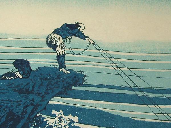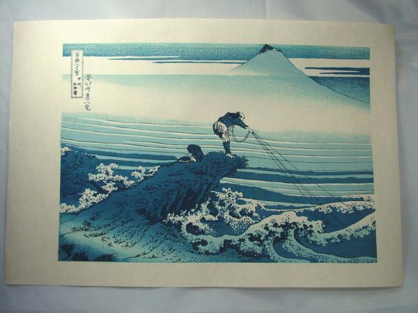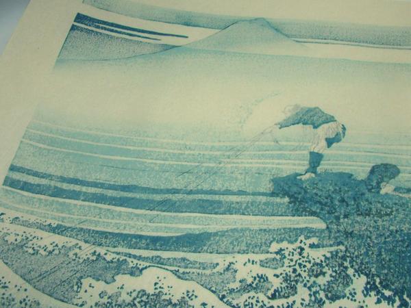 | ★商品説明★ | 技法(種別):木版画 紙質:和紙 外寸:477×317mm 印面サイズ:378×260mm 世界的芸術家、葛飾北斎。その『富嶽三十六景』中の『甲州石班沢』です。龍香堂と親交の有る版画研究室から買い取りました。北斎の描いた富士の自然な美を、手摺木版で忠実に復刻した作品です。 ※画像3は裏面です。版画用染料が裏写りしていますので印刷ではないことを御確認できます。 ◎「富嶽三十六景」四十六枚は、古来日本人のすべてに愛され親しまれてきた富士山を中心に、自然界の風景を幾何学的要素に還元して見る手法を縦横に駆使し、清新な色調で組絵の面白さを求めた傑作で、北斎五十年間の画業は、まさに此処に凝縮されていたと言えます。 【作品解説】甲州石班沢(View from Kajikazawa in Kai Province) この図を見ると一幅の漢画を見る思いがする。激流の中につき出た巨巌の上で父子の漁師が綱を打っている。 その構図、その人物の配置、描写にはまことに北斎ならではの緊張感と構図美がある。中景の流れから富士のきびしい姿へのもり上りも、前景と調和がとれている。漁師の綱の4本の紐が画面に生気を与えている。石班沢は鰍沢あたりの急流であろう。46枚中の佳作の一つである。 |