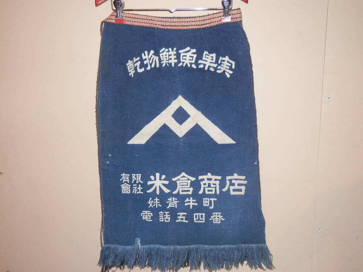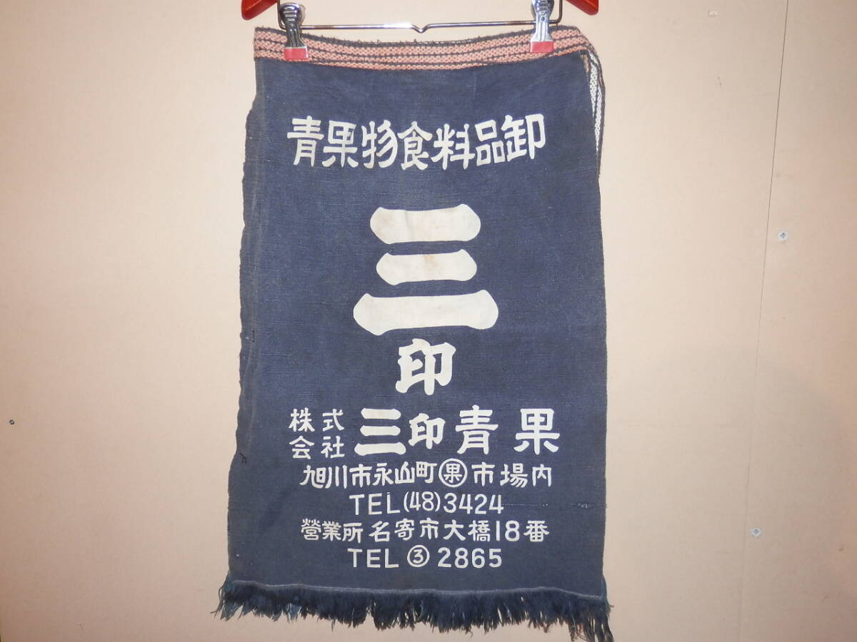 帆前掛け#105 旭川市三印青果/妹背牛町米倉商店 85x67cm 帆布エプロン 古布 紺色 北海道 昭和レトロ