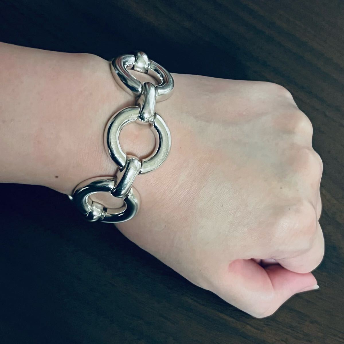 分厚いサークル リンクは幅が約2.9cmあり総重量は100gを超え、ヴィンテージティファニーの中でも特に重厚感のあるブレスレットです。