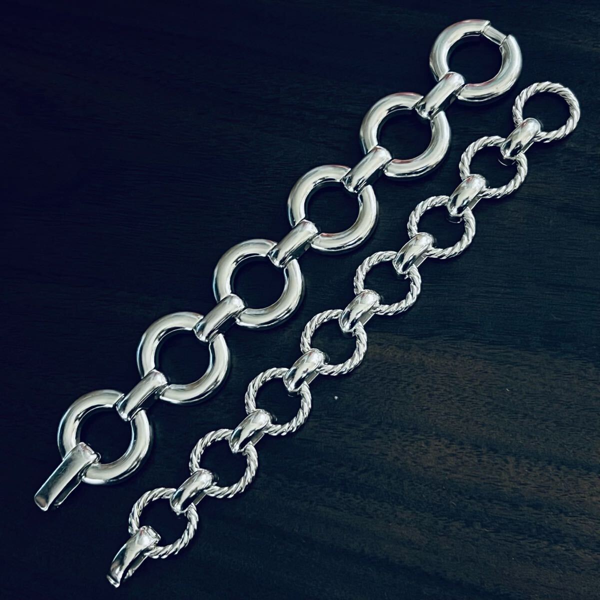 リンクの大きさ比較用に現在、出品中のツイスト サークル ブレスレットと並べた写真を掲載いたします。参考までにご確認ください。