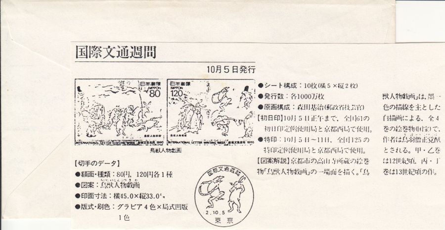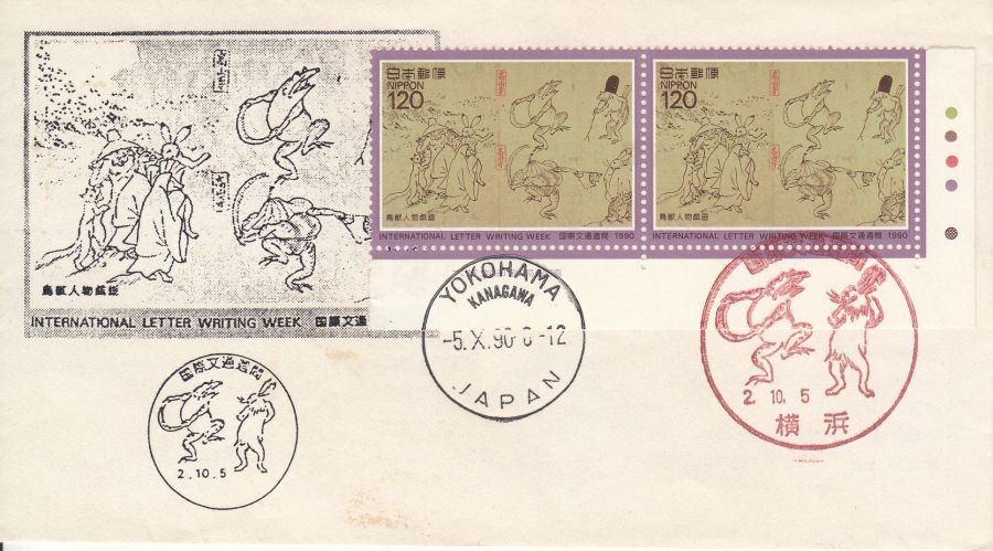 【封筒・横書き】鳥獣人物戯画 120円切手2枚貼り (鳥獣人物戯画 横浜 2.10.5 記念印)