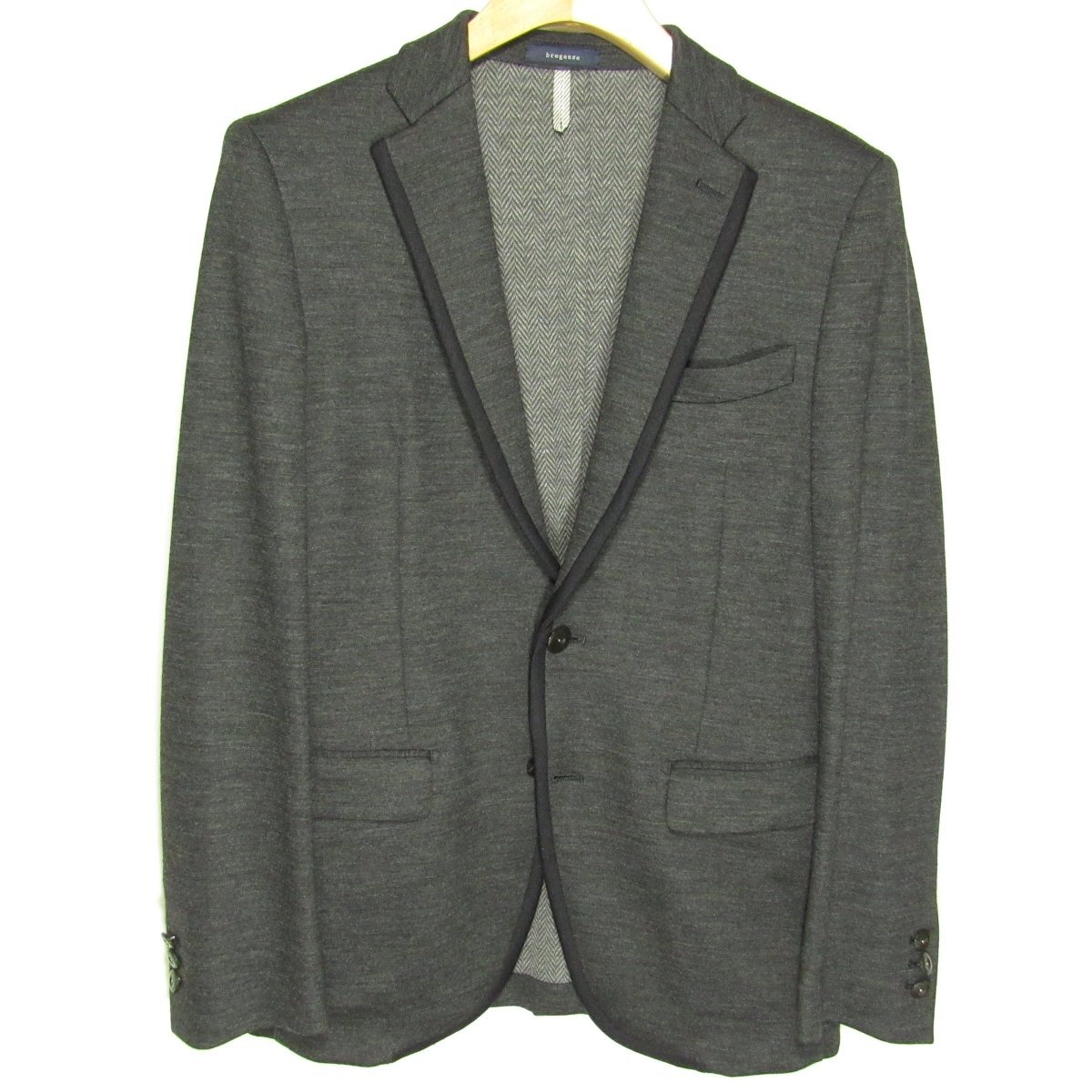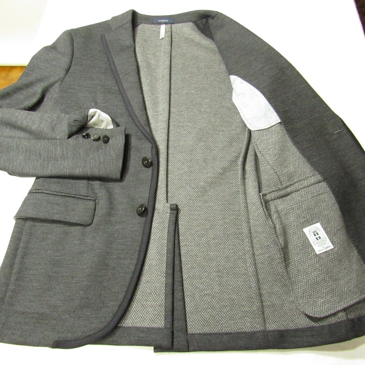 | 表地-毛55% 綿40% ポリウレタン5% / 袖裏地-キュプラ チャコールグレー / パイピング部は濃紺 / 内側はグレー系のヘリンボーン |