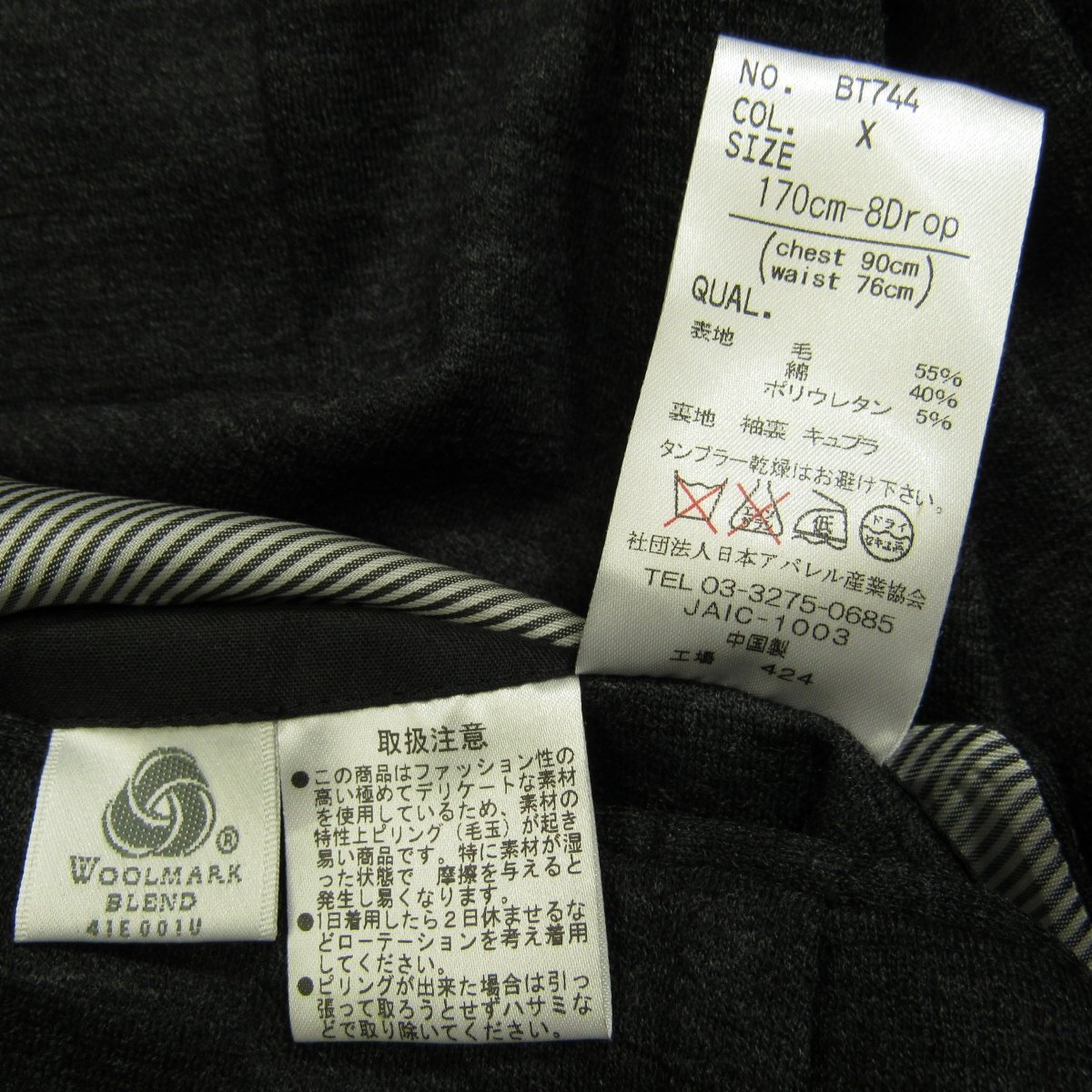 | 表記サイズ 170cm-8Drop チェスト90cm ウエスト76cm (目安サイズ:Y5[細身のMサイズ]相当) 実寸サイズ(cm) 身幅/46.5 肩幅/43.5 着丈/67 袖丈/60.5 ラペル幅/7 ゆき丈/81 第1ボタン位置の胴幅/42.5 |