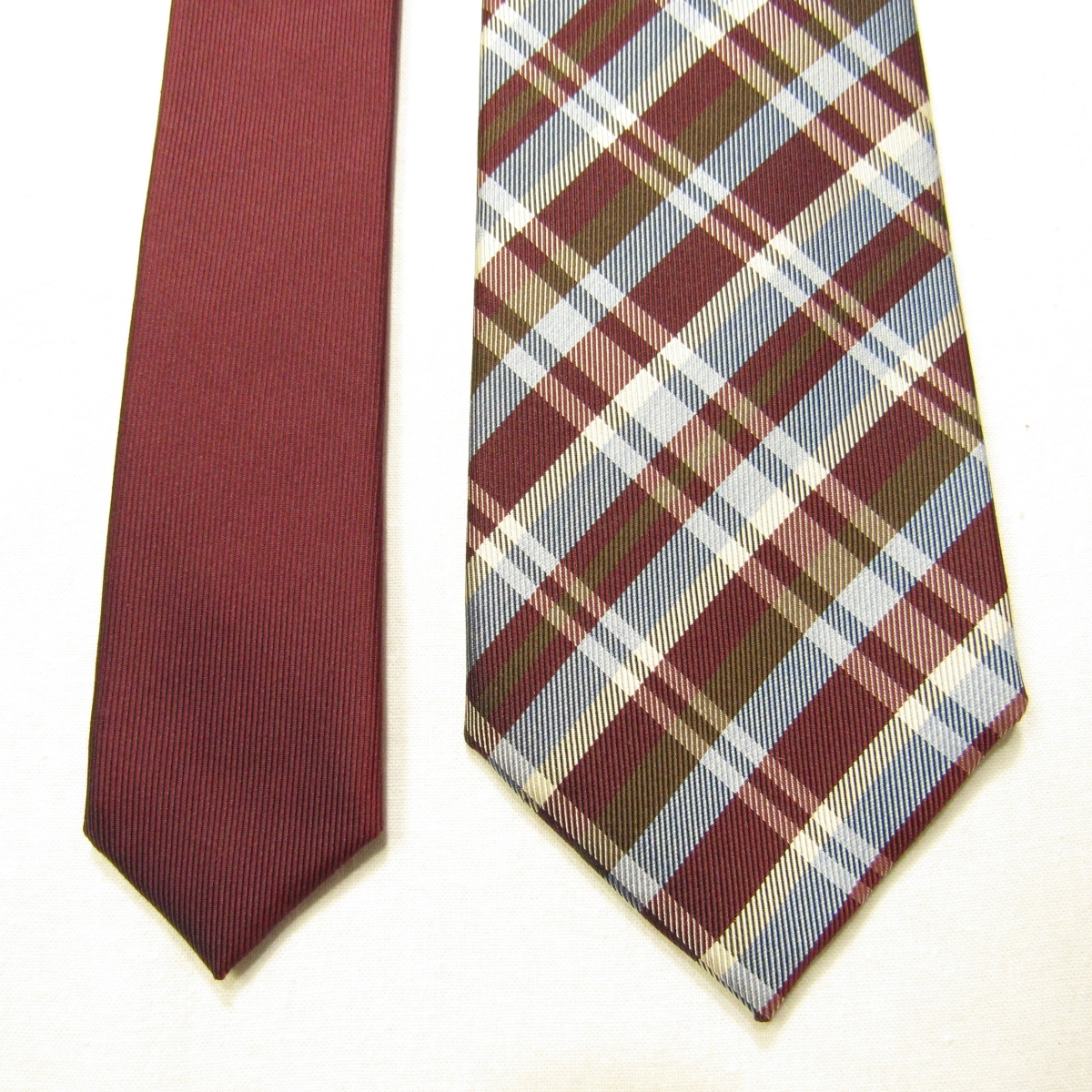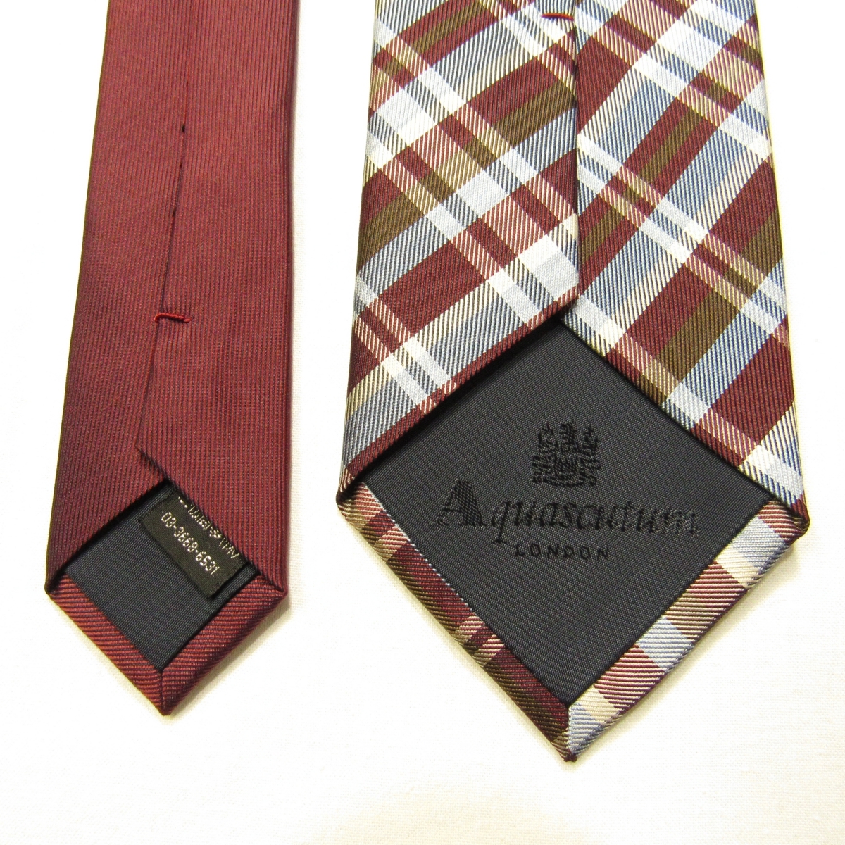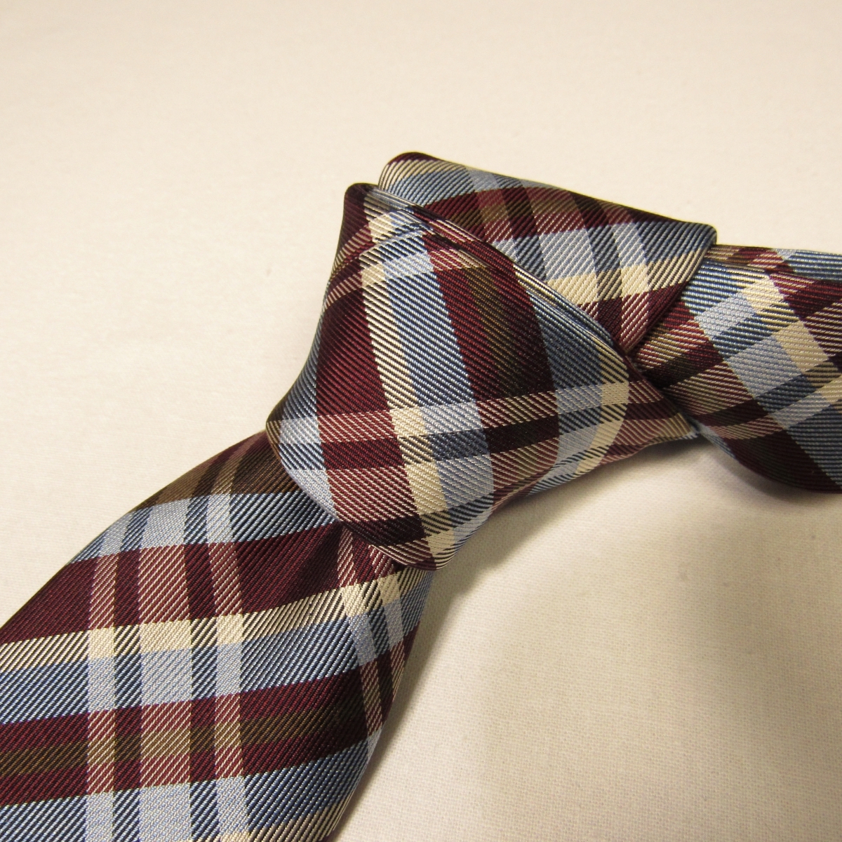 絹 100% 【大剣側】ワイン×サックスブルー×オフホワイト×ブラウンのチェック柄 【小剣側】ワイン無地 |