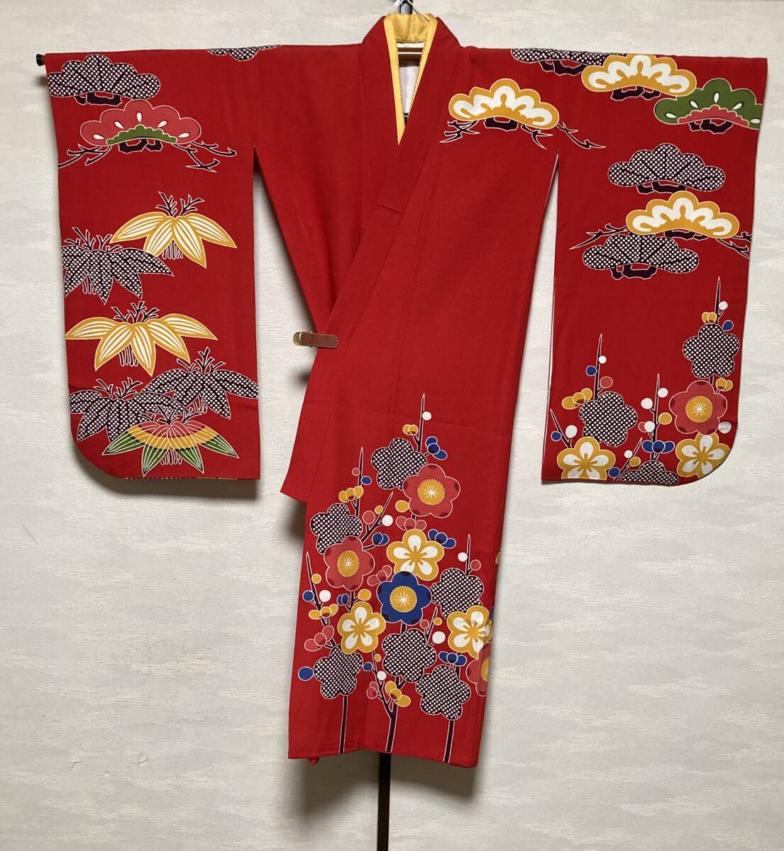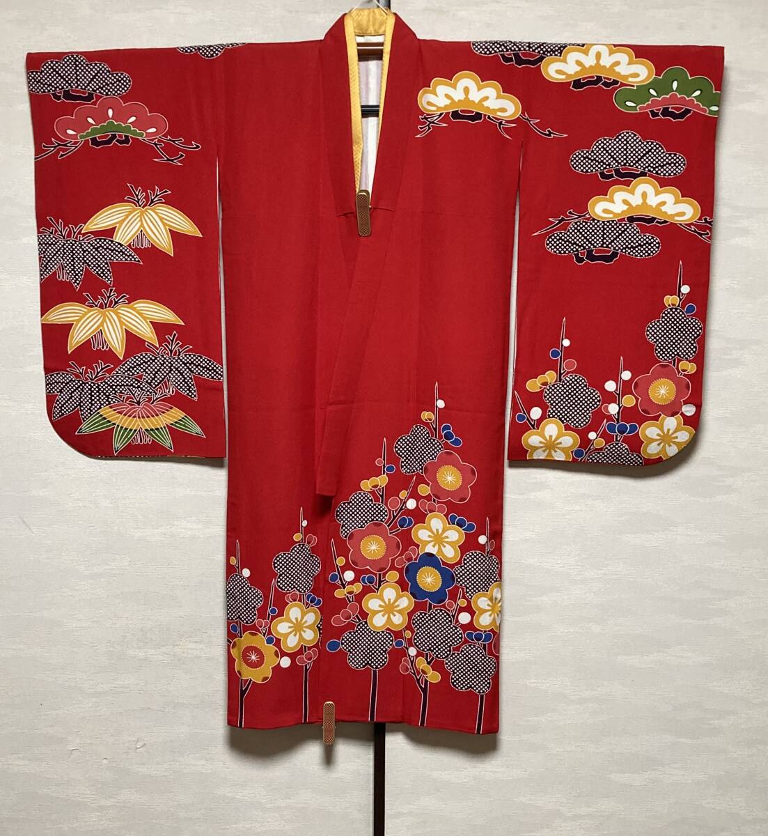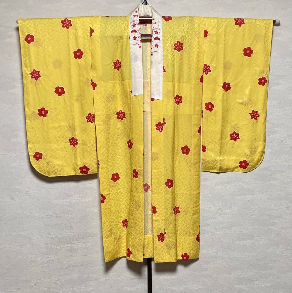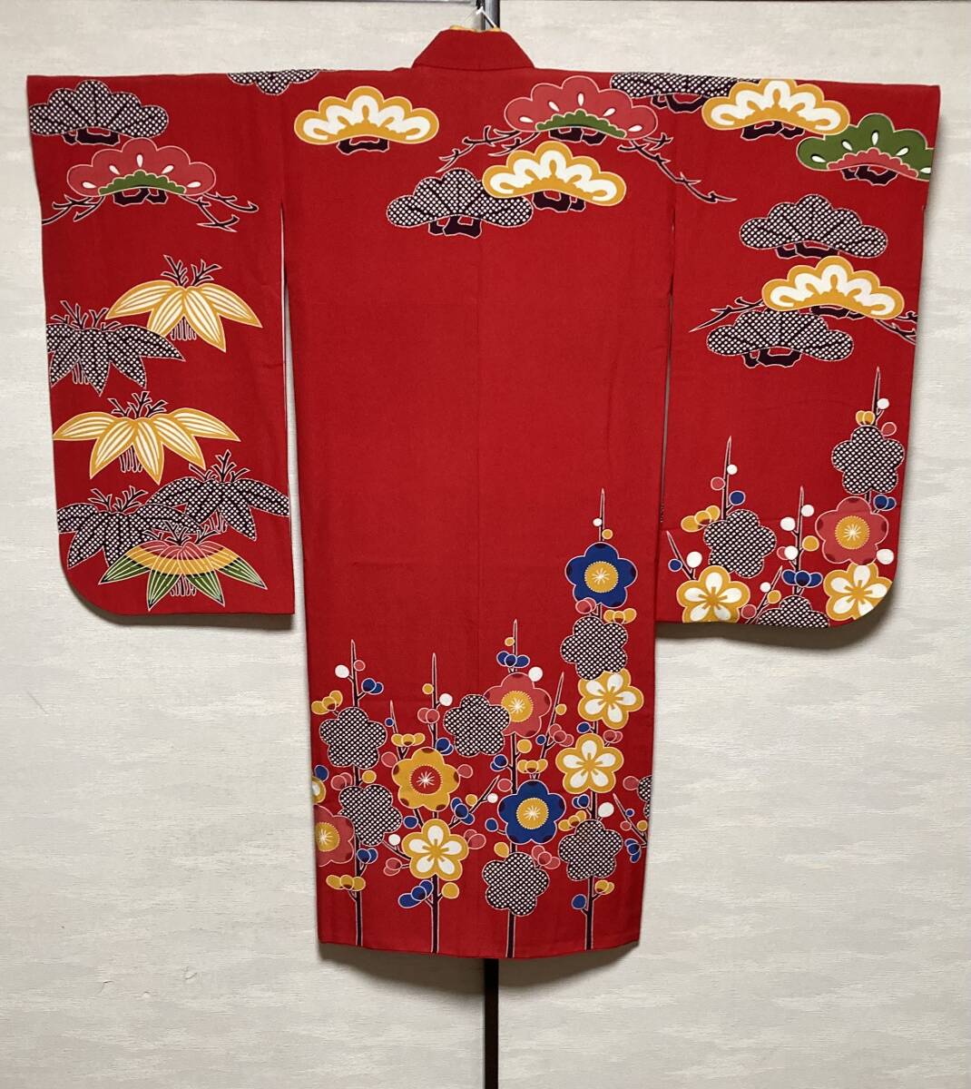もともと栗山吉三郎の四つ身はお作りが少なく貴重なお品です。深みのある可愛らしい赤で紋様もおめでたいものです。シボのたった上質な生地はどっしりとしています。お襦袢も絞りの入った高級品です。