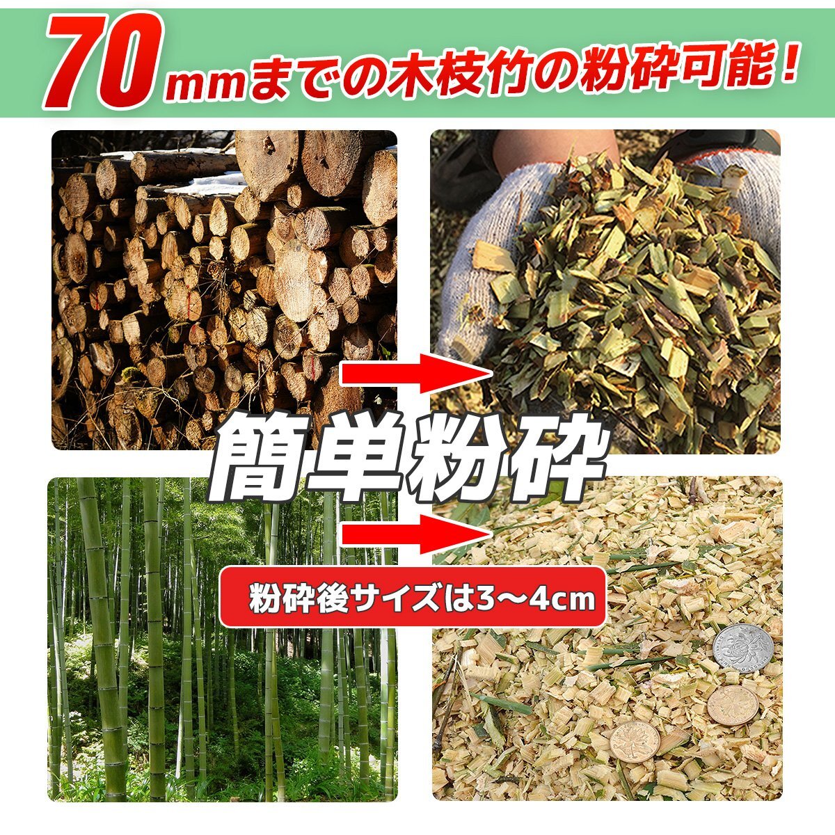 | 商品の詳細 | 7.5馬力の強力パワーモデルです。 農家、造園業、自治体などで使用するのに最適!もちろんご家庭 でもご使用いただけます! 枝や竹、ワラ、草などはもちろん、生木や木材などの固い木まで対応可能です。 投入口がナナメになっておりとても大きいので、木材などを放り込む だけで簡単に処理してくれます。 そのため、今まで押し込まないといけなかった作業が、短時間で終わらせることができます。 とても簡単で作業効率も上がります! 角度調整機能付きのブロアーから排出されますので、トラックへの積み込みや袋詰めなどが簡単です。 また、タイヤが付いており、キャリアータイプですので移動も簡単です。 排気量:212cc 刃回転:3000RPM 燃料タンク容量:3.6L オイルタンク容量:0.6L(10W-30) 粉砕装置最大処理径:70mm 始動方式:リコイル 粉砕方式:カッター 重量:NT80kg /GT 92kg 安全装置:非常停止ボタン 組立サイズ:1250mm×500mm×1140mm 梱包サイズ:970×380×850mm 日本語取扱説明書 ※粉砕できない物 ビニール ・ ペットボトル ・ 空き缶 ・ 鉄製品 ・ 紙類 ・ 発砲スチロール ※土の付いた草などはミル内部にこびりつく為、粉砕できません。 ※粉砕物に石などが含まれている場合、刃が欠けたり、割れたりします。 金属、ボトル、カンやその他異物は、本機の中に絶対に入れないでください。 色:赤色 | |