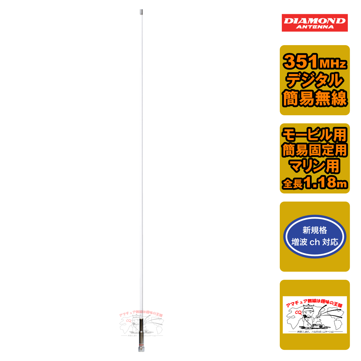 1. 351MHz帯デジタル簡易無線用アンテナで、エレメント 部にとてもスリムなFRPパイプを採用したモービルアンテナです。簡易固定局用アンテナとしても十分に性能を発揮する ことができます。