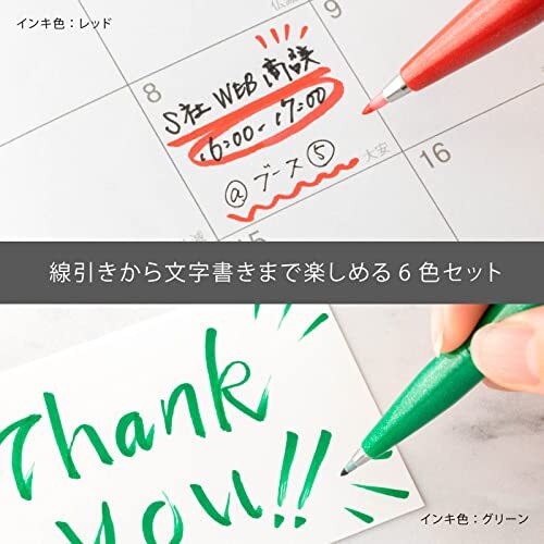 ・6色スタンダードカラー SES15C-6STA・・Color:6色スタンダードカラー・【特長】しなやかなペン先で筆のような筆記線が楽しめる・【6色カラー】ブラック・レッド・ブルー・グリーン・ピンク・スカイブルー・【インキ】水性染料・【1本あたりサイズ/重さ】幅 17 ×奥行13mm × 長さ 133mm/9g・【材質】キャップ・軸=再生PP 尾栓=PE ペン先=ポリエステル・POM 中綿=アクリル繊維 先金=真鍮筆のような筆記感が楽しめる「筆タッチサインペン」イラスト、カリグラフィー、メッセージカードなどの用途に便利。鮮やかな発色の水性染料インキ。 ロングセラーのサインペンに筆のタッチをプラス。
