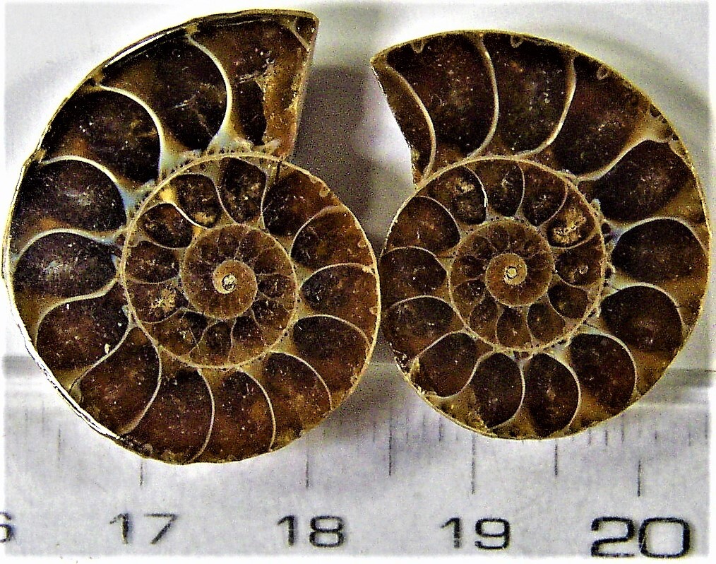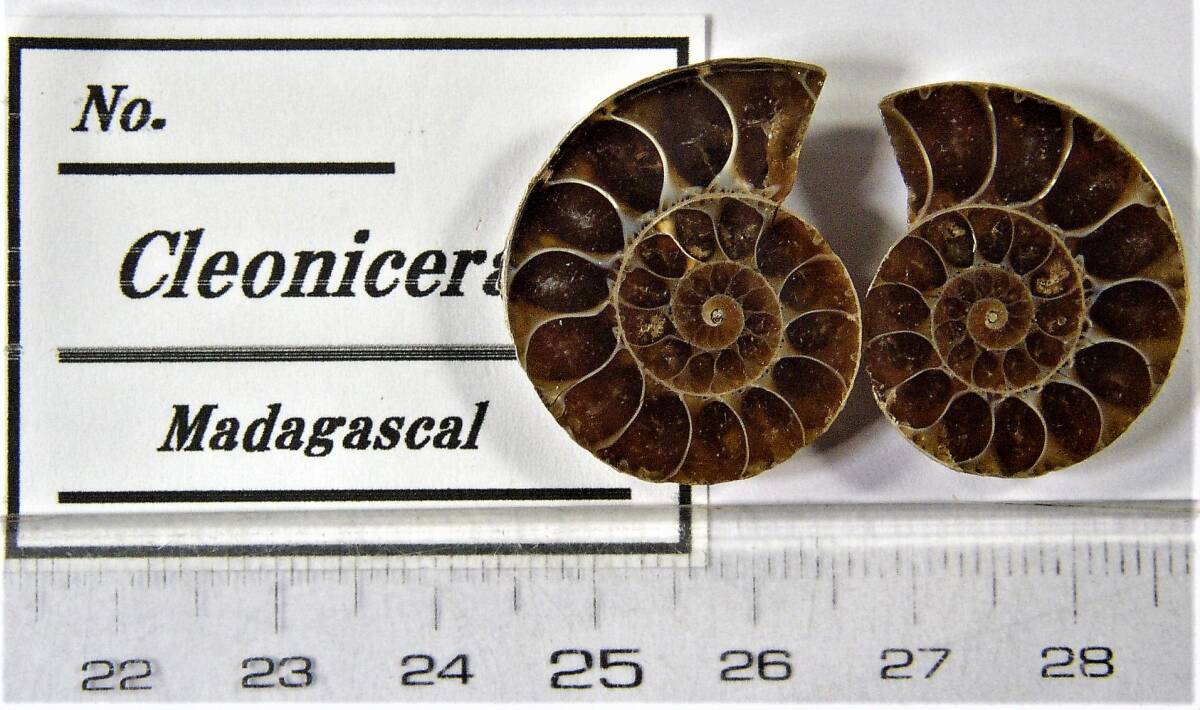 アンモナイト・クレオニセラス化石の全体が方解石に置換されています。半分に切断しアンモナイト特有の内部の隔壁が観察できます。