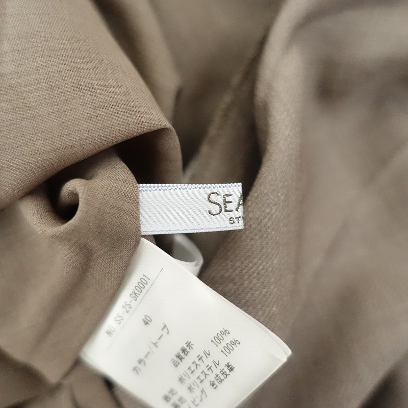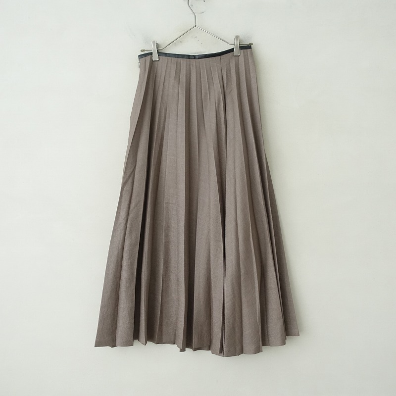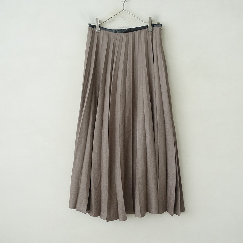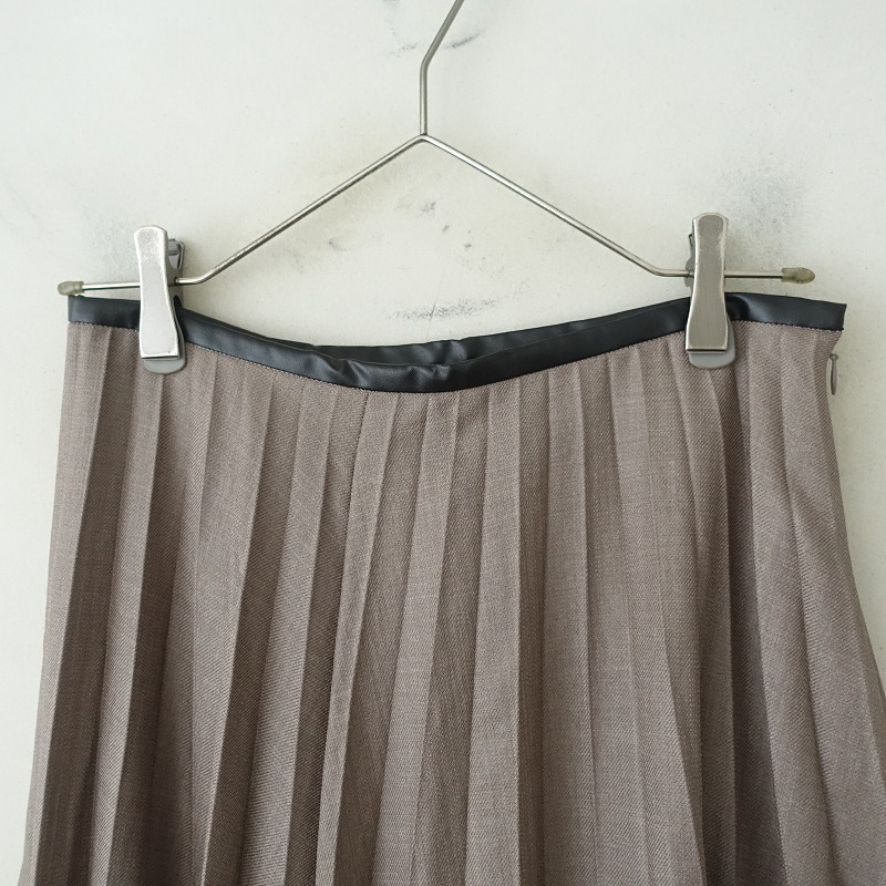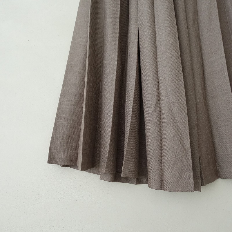 SEASON STYLE LABのプリーツロングスカートです。カラーはダークグレージュ杢(表記:トープ)です。ポリエステル100%の艶のある薄手ツイル生地を使用。サラリとした裏地付きで仕立てられています。ウエストは合成皮革のパイピング仕様。左のジッパー開きです。裾に向かい広くなったプリーツ加工が施されております。ポケットはございません。 |