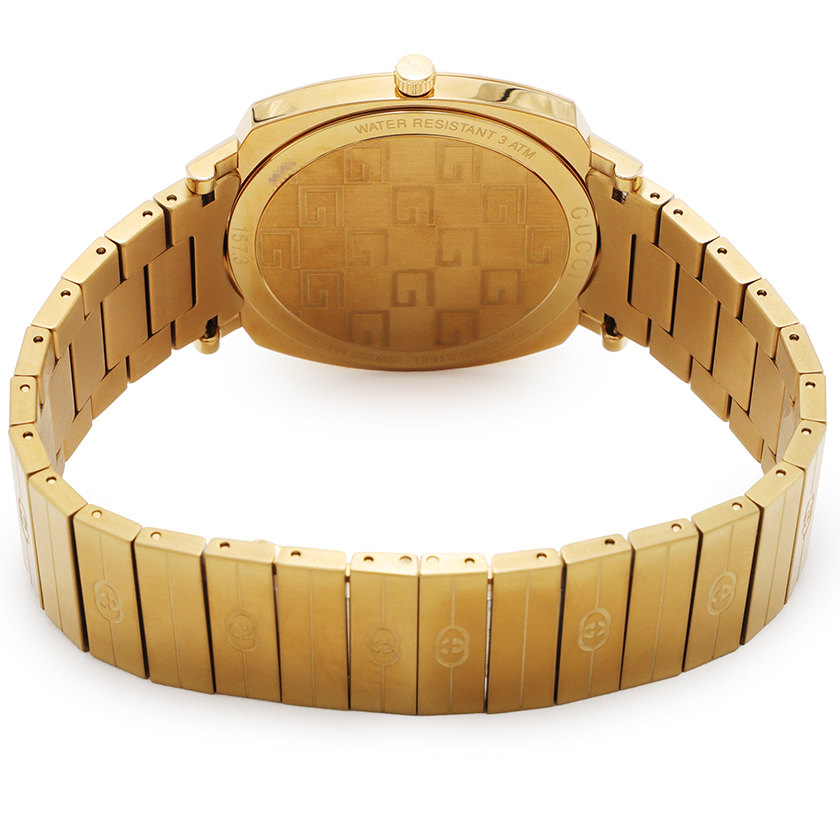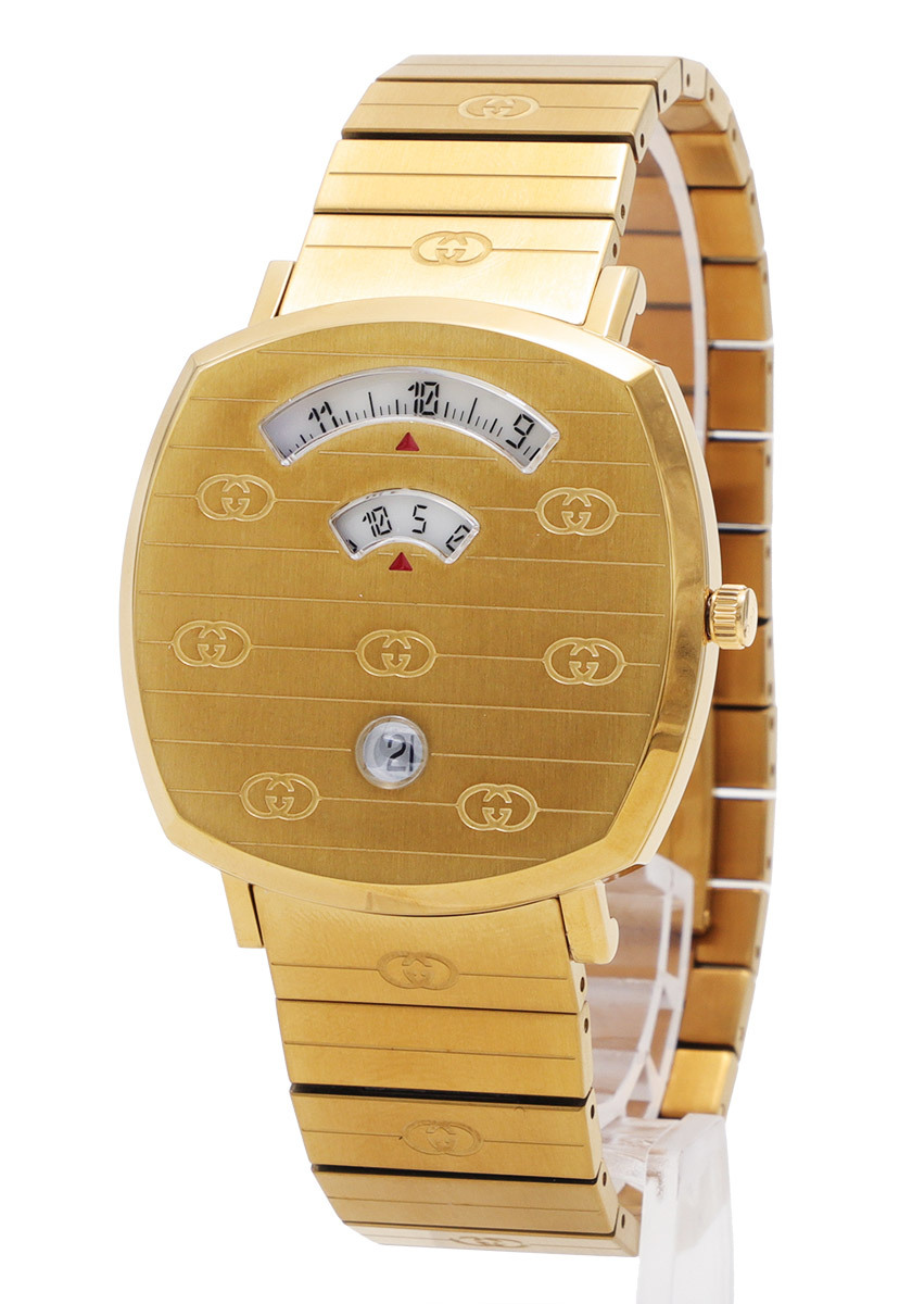 | 1970年代後半のスケートボーダーにインスピレーションを得たクッション形フラットな厚さ6ミリの38ミリゴールドケースに時間・分・日付を表示する3つの窓を設けたグリップクオーツは、通常の時計とは一線を画すデザインも斬新なグッチ人気のジェンダーレスモデル。ボードに足元を密着させるグリップテープに由来し、スリムな薄型ボディがフィット感にも優れます。中でも3つの窓から覗くホワイトディスクも通常とは逆の左回りで表示されるこのモデルは、ブレスに境目のない両開きバックルも魅力。ケースとブレスにはグッチのアイコン“インターロッキングG”とボーダーが施されて手元をスタイリッシュに彩ります。 |