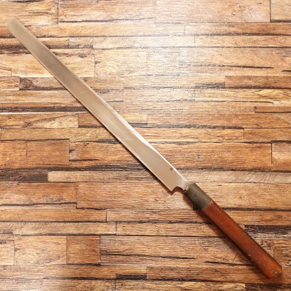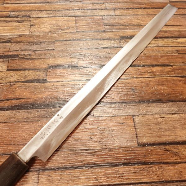 このお品は片刃のハガネ製で、鋭い切れ味が魅力です。使用感あまり感じないキレイな蛸引包丁です。刃渡り335mmの本格的なお刺身包丁です。