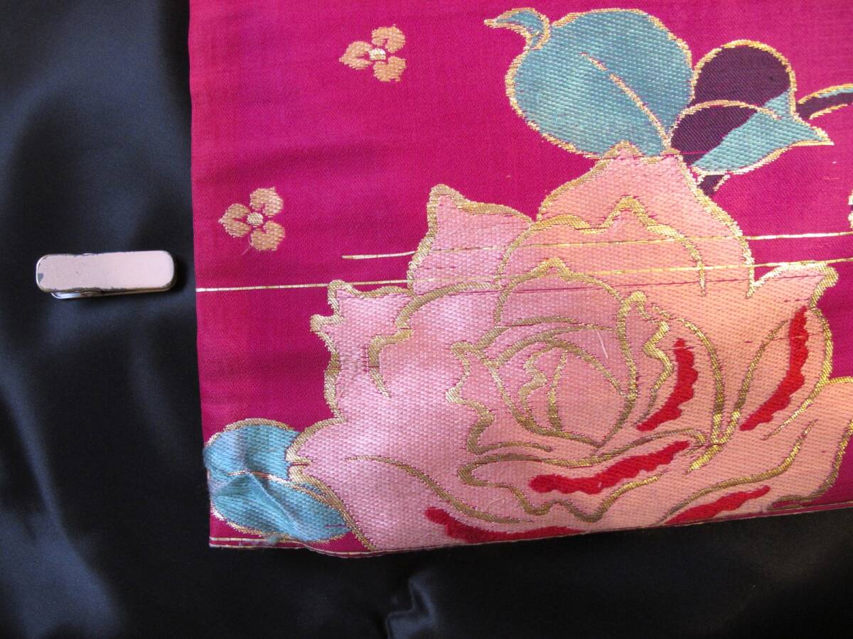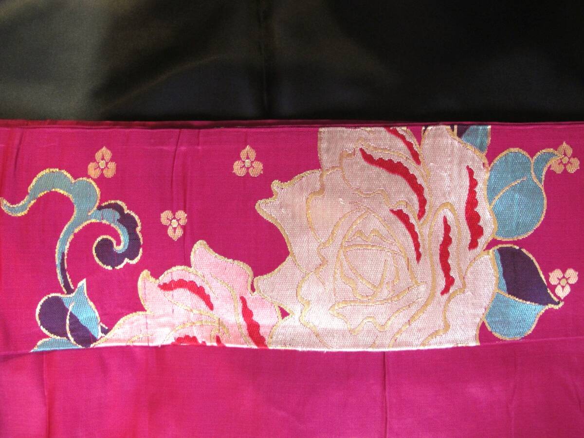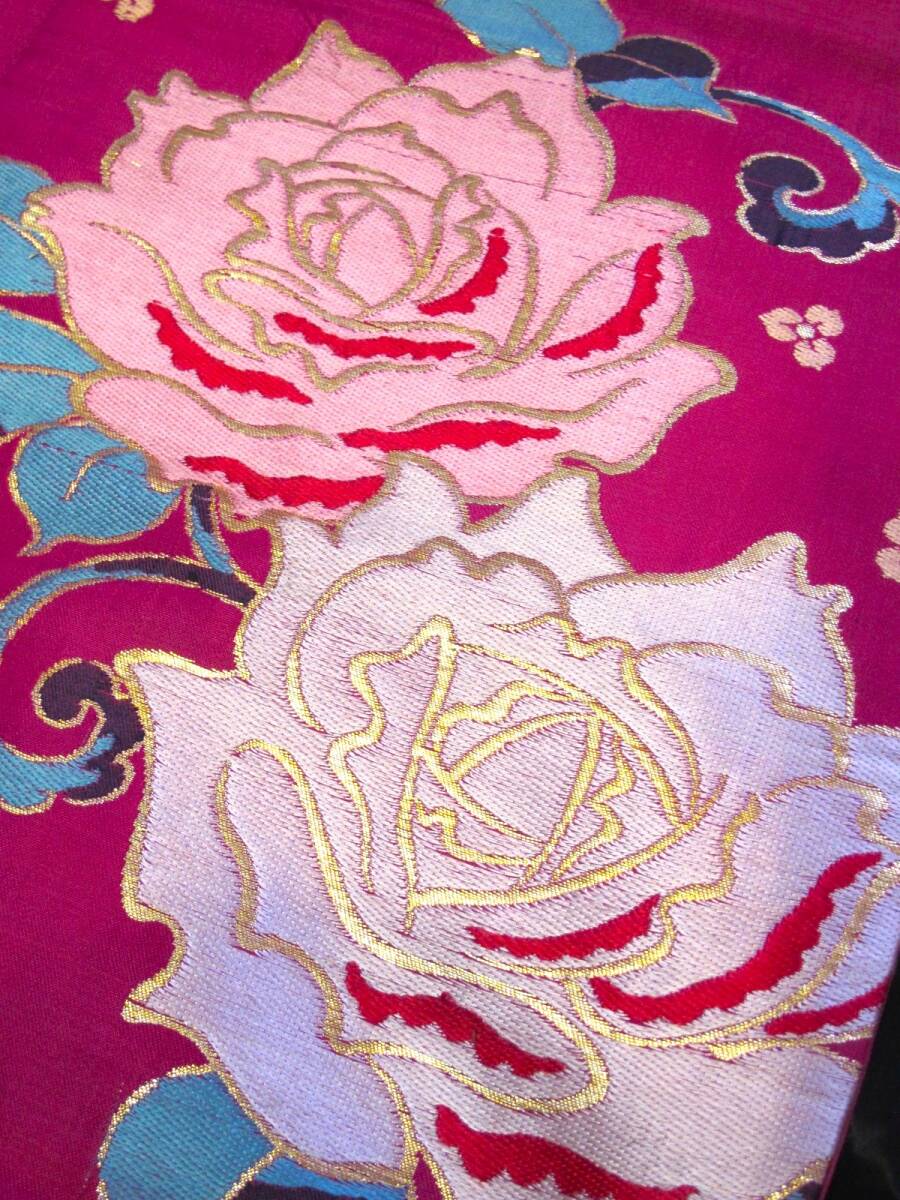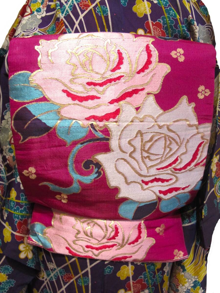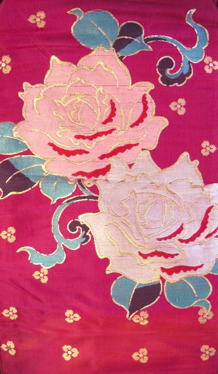 大輪の薔薇に唐草の、色合いも華やかなアンティーク名古屋帯です。 |
