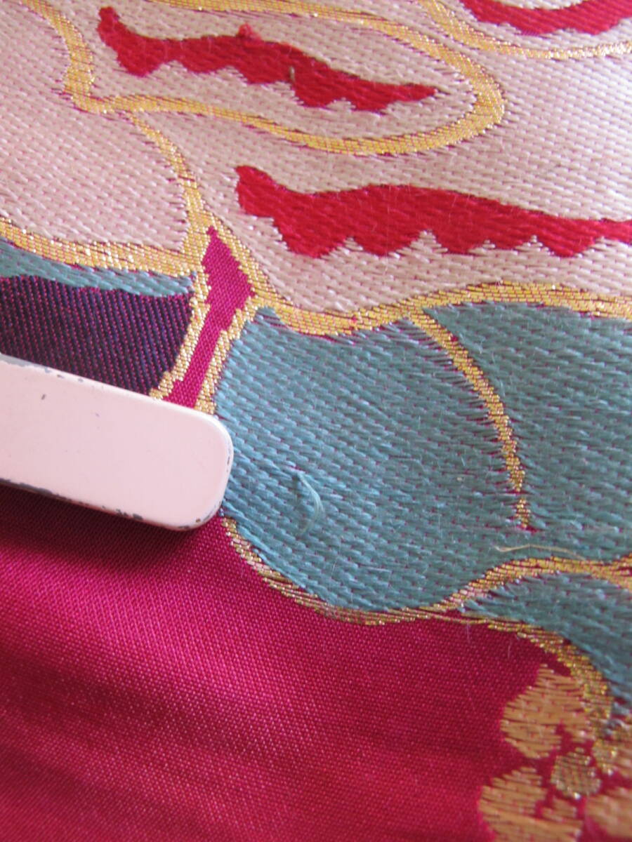 地のくすみはありません。 お太鼓下(隠せそうです)、たれ先端に薄い変色 一部織り糸の乱れがあります。 アンティークに慣れた方はご着用可能と思いますが、神経質な方はご遠慮ください。 アンティークにつき、他少々の事はあるとお考えください。 タイトルのお品1点の出品です。コーディネートに使用したお品は別出品か、参考商品です。 |