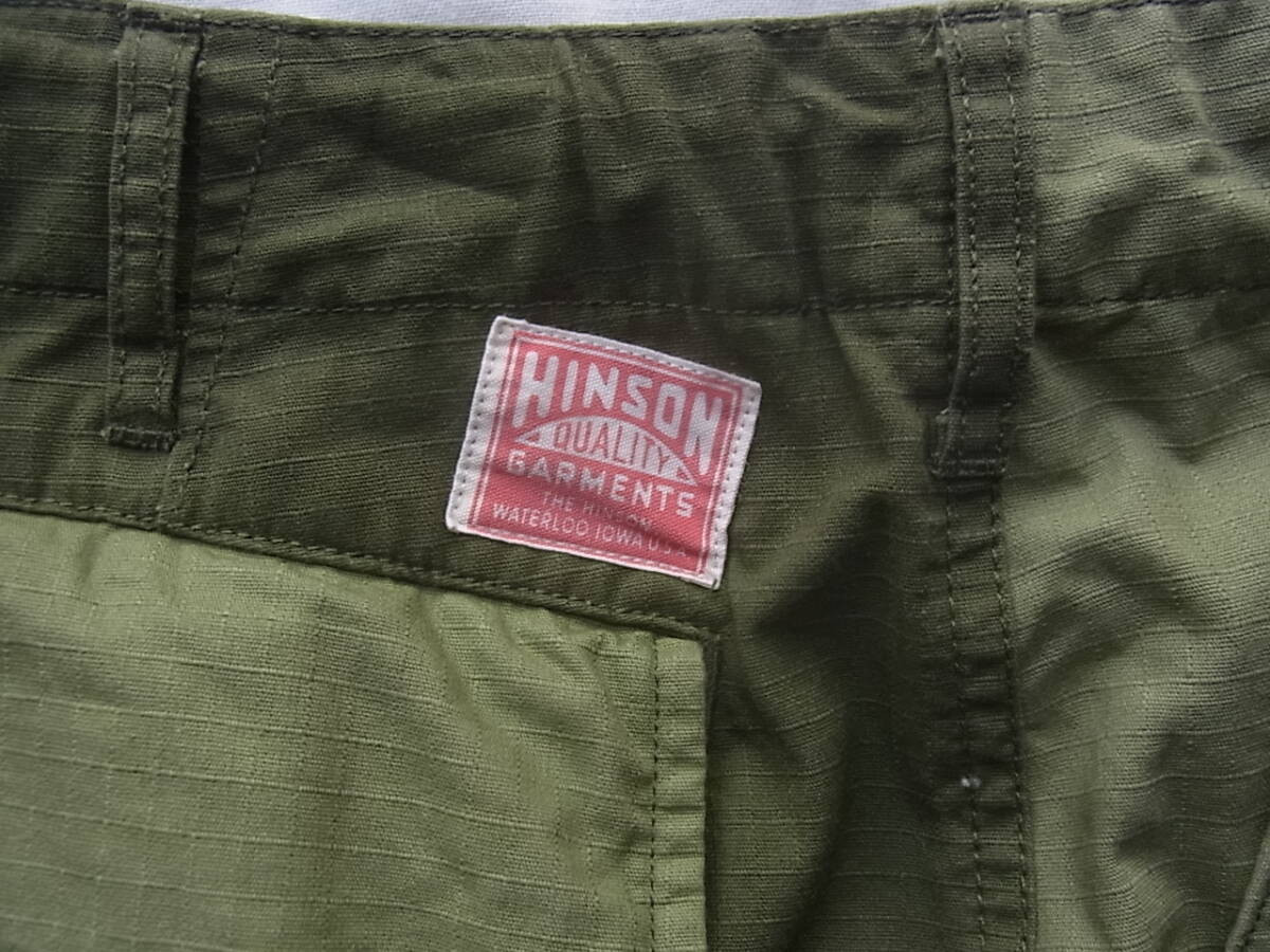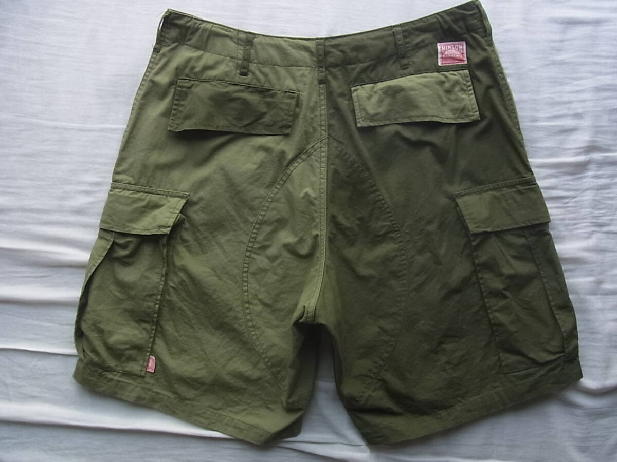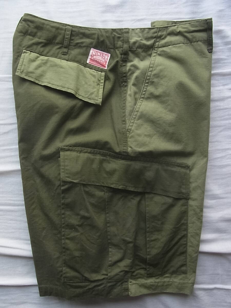 ヒンソンの濃淡オリーブのコットンリップストップ素材を切り替えたデザインのイージーカーゴショーツになります。USEDで着用感は御座いますが、特に目立ったダメージ等は御座いません。